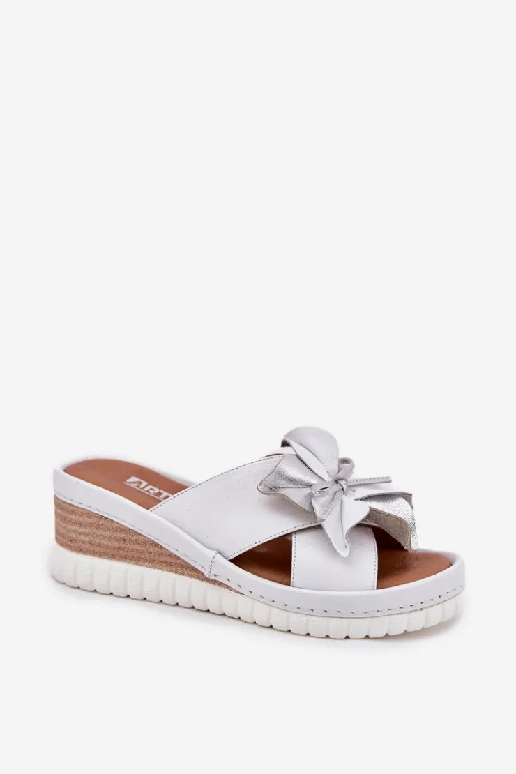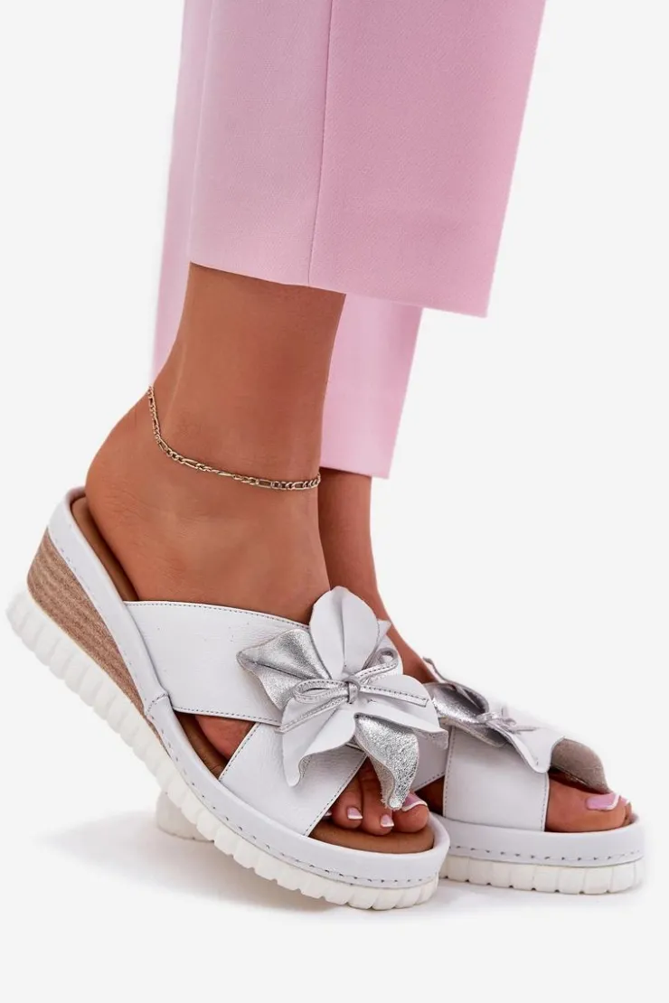 Damskie klapki wykonane z wysokiej jakości naturalnej skóry. Osadzone na koturnie. Z przodu buta znajduje się subtelny ozdobny kwiatek, który dodaje wyjątkowego charakteru. Bardzo miękka wkładka zapewnia komfort przez cały dzień, sprawiając, że te klapki będą idealnym wyborem do letnich stylizacji, łącząc funkcjonalność z modnym wyglądem. Przy wyborze rozmiaru prosimy sugerować się tabelą rozmiarów.