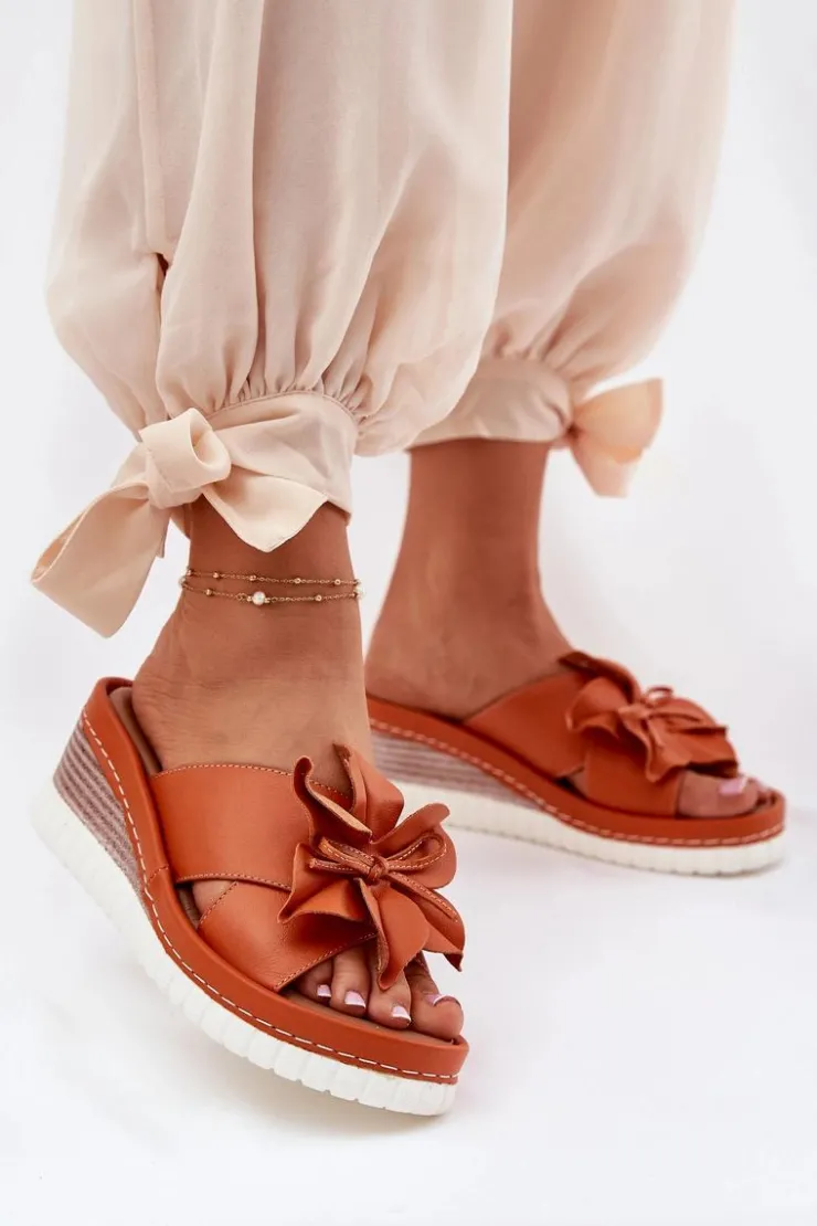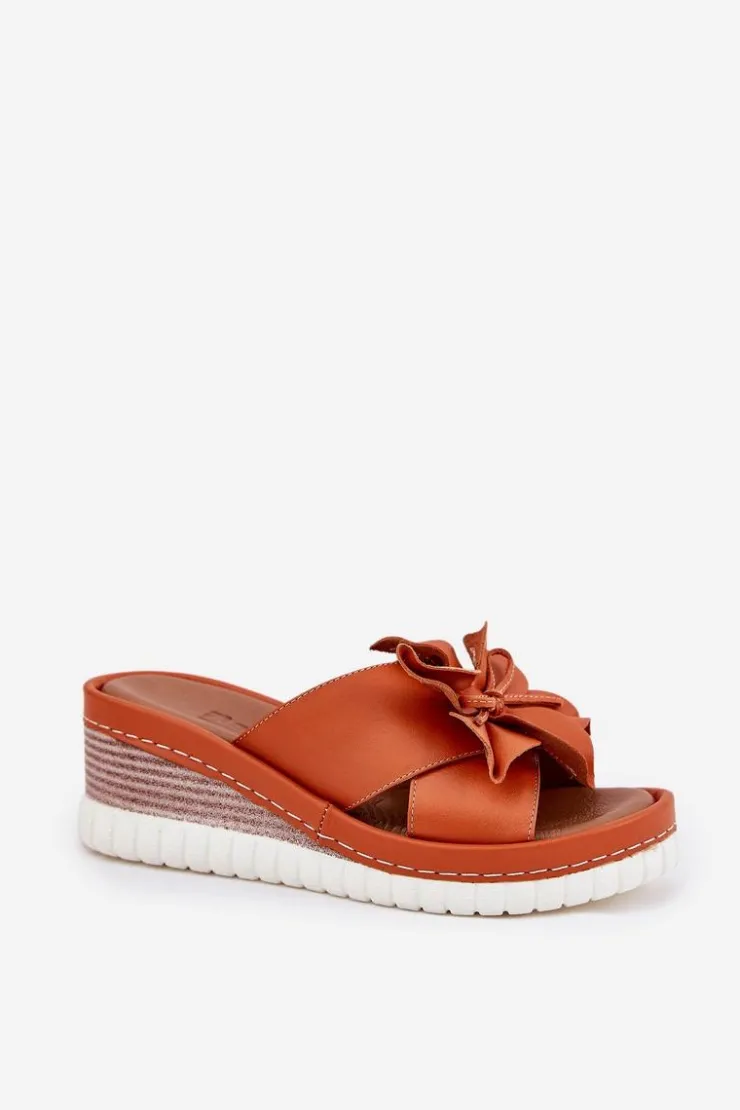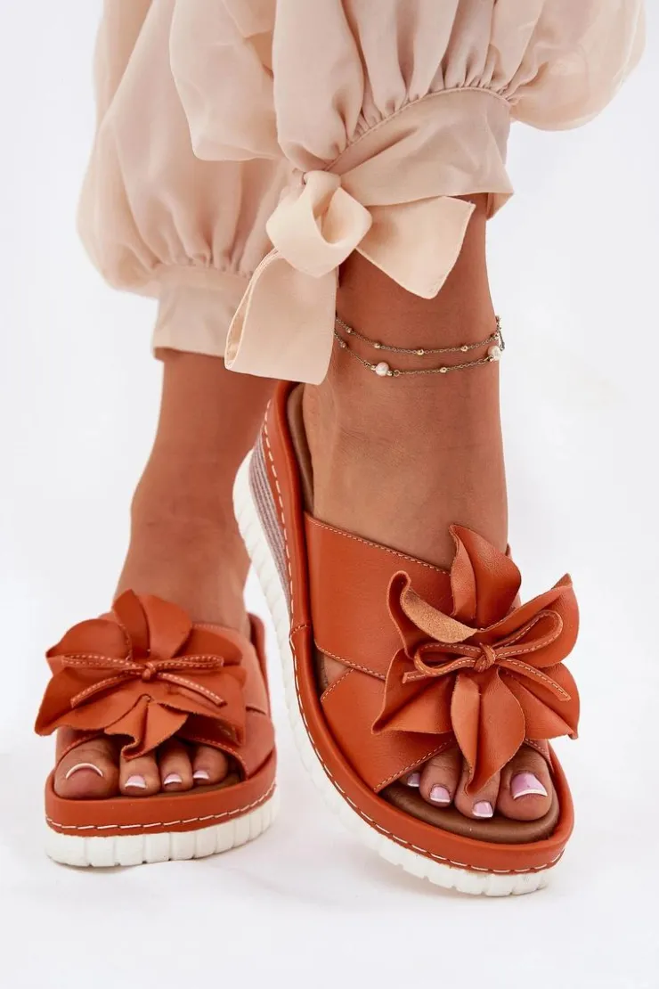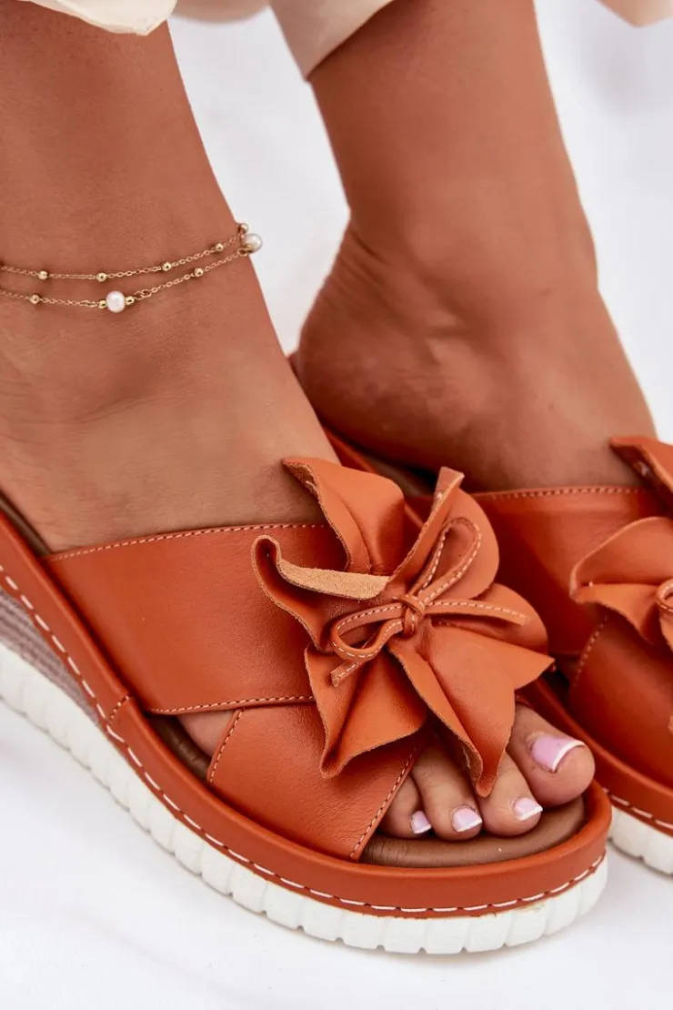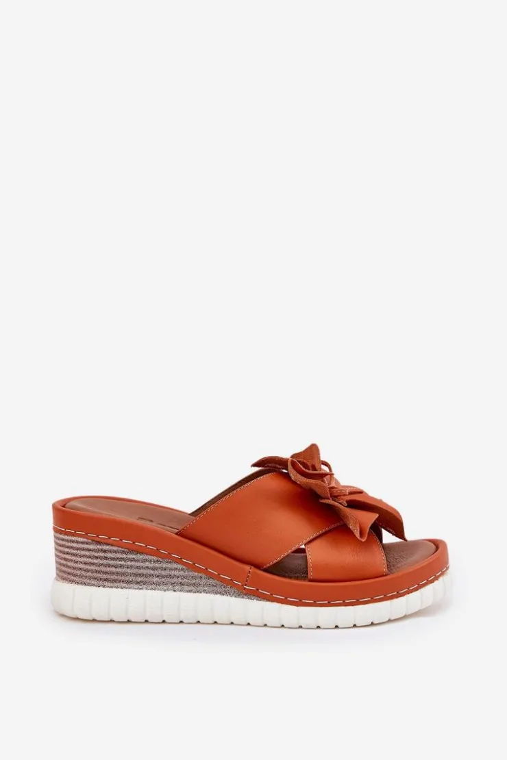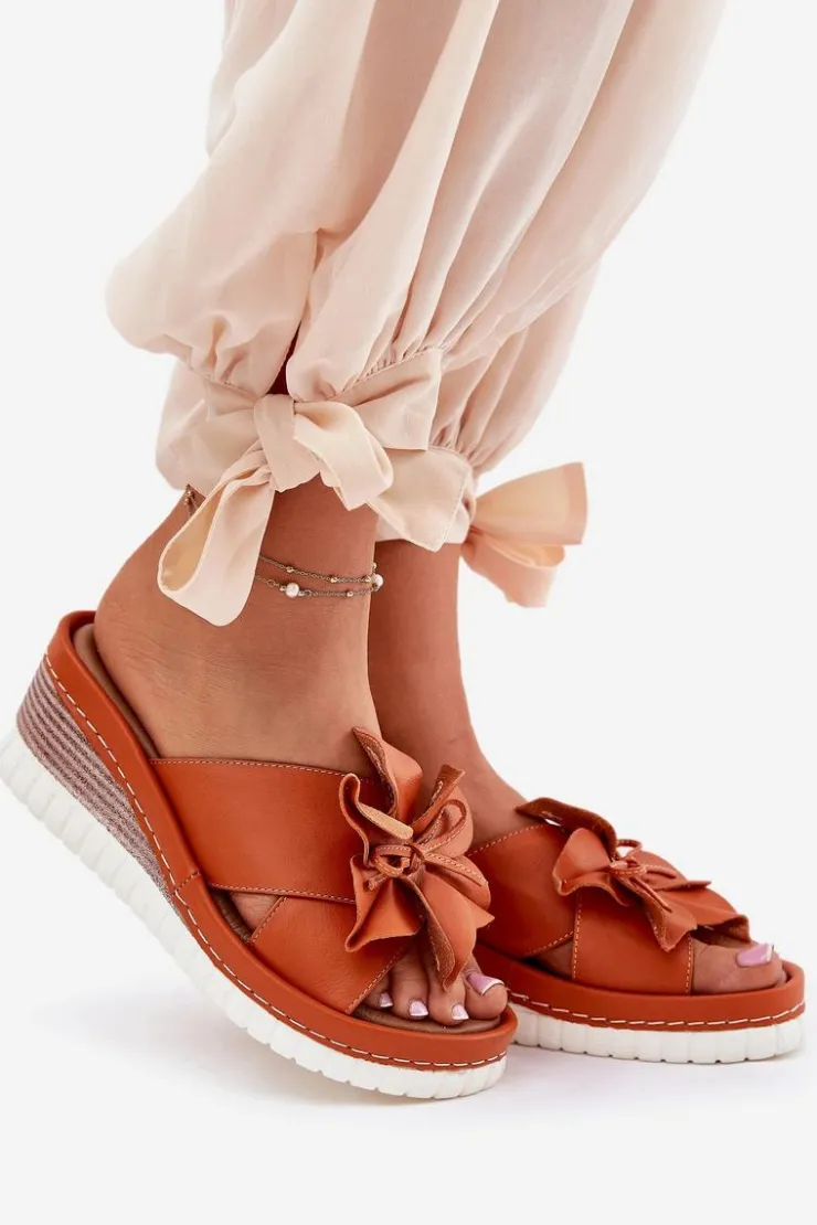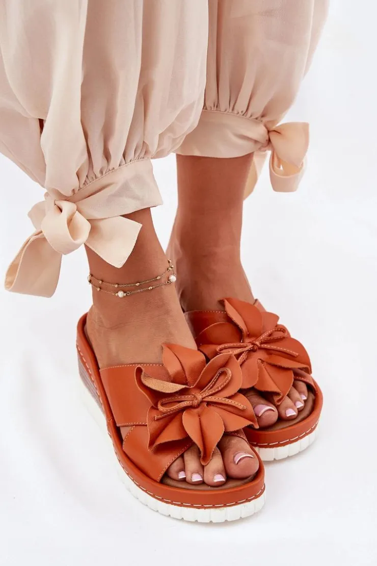 Damskie klapki wykonane z wysokiej jakości naturalnej skóry. Osadzone na koturnie. Z przodu buta znajduje się subtelny ozdobny kwiatek, który dodaje wyjątkowego charakteru. Bardzo miękka wkładka zapewnia komfort przez cały dzień, sprawiając, że te klapki będą idealnym wyborem do letnich stylizacji, łącząc funkcjonalność z modnym wyglądem. Przy wyborze rozmiaru prosimy sugerować się tabelą rozmiarów.