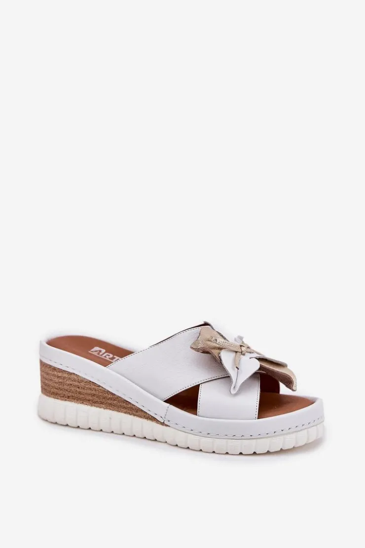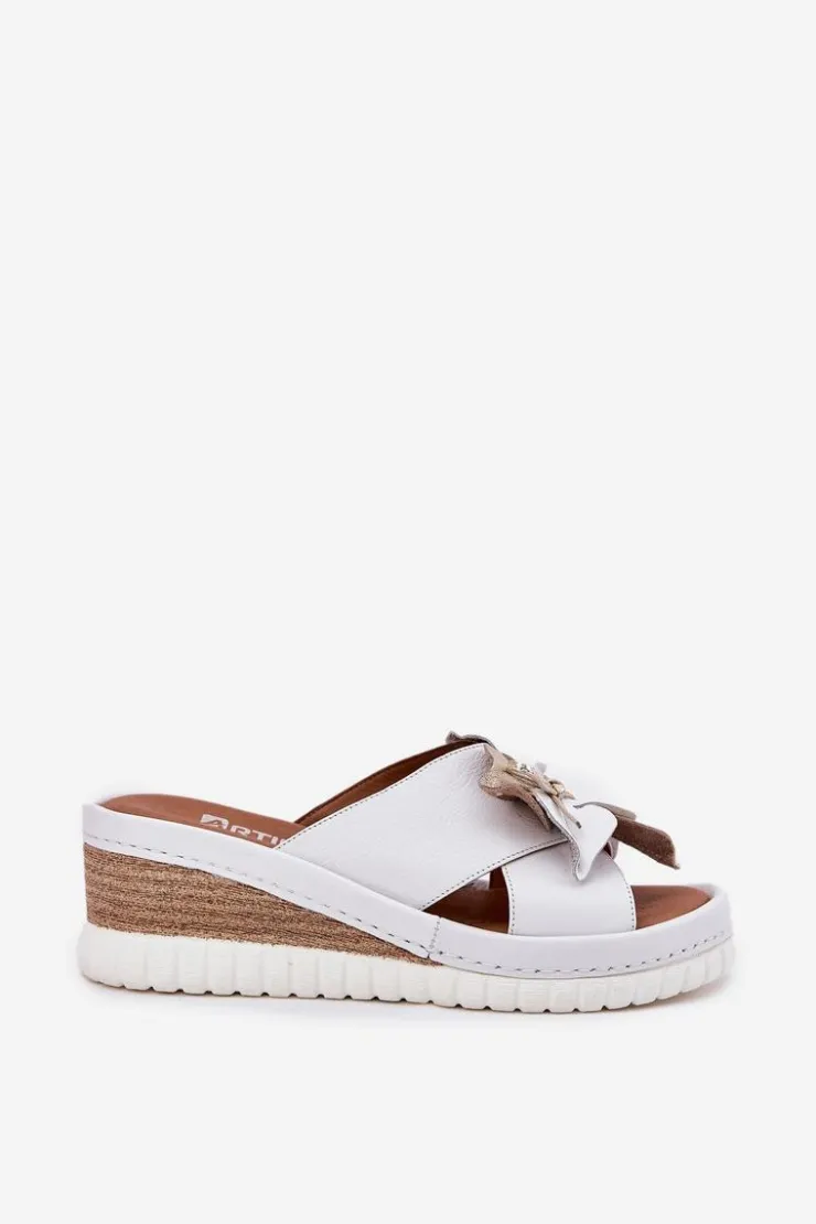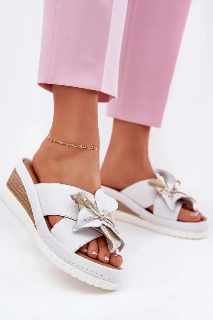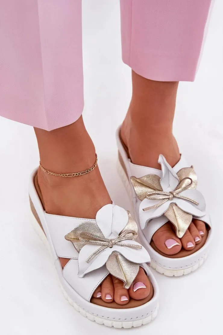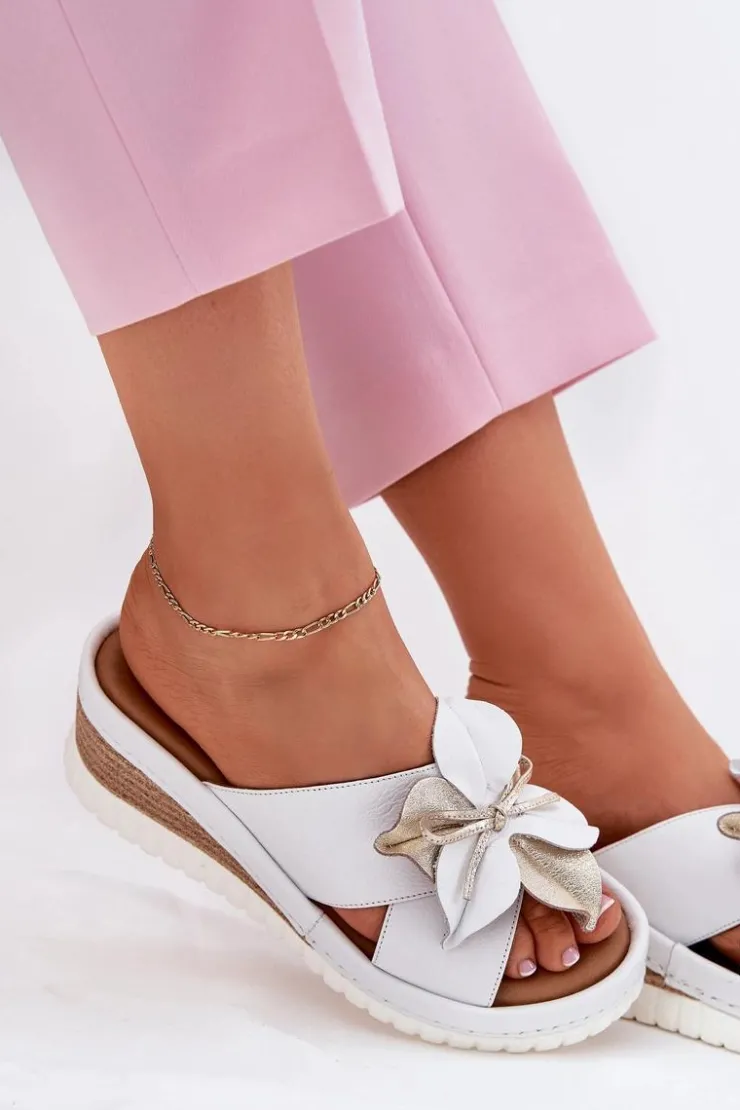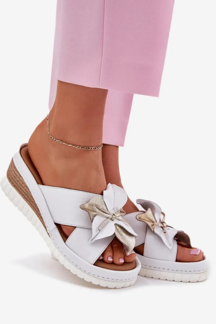 Damskie klapki wykonane z wysokiej jakości naturalnej skóry. Osadzone na koturnie. Z przodu buta znajduje się subtelny ozdobny kwiatek, który dodaje wyjątkowego charakteru. Bardzo miękka wkładka zapewnia komfort przez cały dzień, sprawiając, że te klapki będą idealnym wyborem do letnich stylizacji, łącząc funkcjonalność z modnym wyglądem. Przy wyborze rozmiaru prosimy sugerować się tabelą rozmiarów.