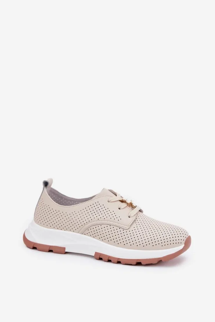 Półbuty damskie w sportowym stylu wykonane z naturalnej skóry to połączenie komfortu i modnego wyglądu. Osadzone na platformie, zapewniają lekkość i wygodę przez cały dzień. Sznurowanie ozdobione przypinką w kształcie kwiatuszków dodaje im urokliwego akcentu, a zaokrąglone noski gwarantują pełną swobodę ruchu. Skórzana wkładka dba o komfort stóp, czyniąc te półbuty doskonałym wyborem na co dzień. Przy wyborze rozmiaru prosimy sugerować się tabelą rozmiarów.