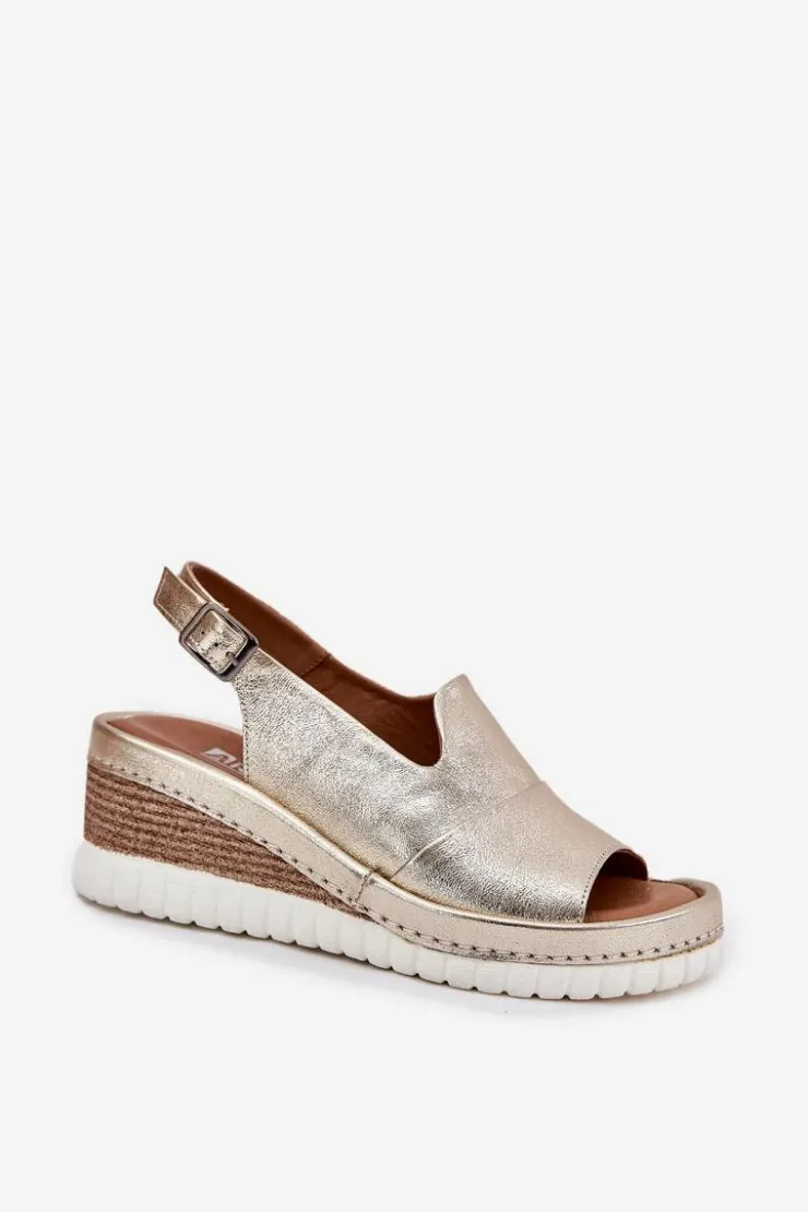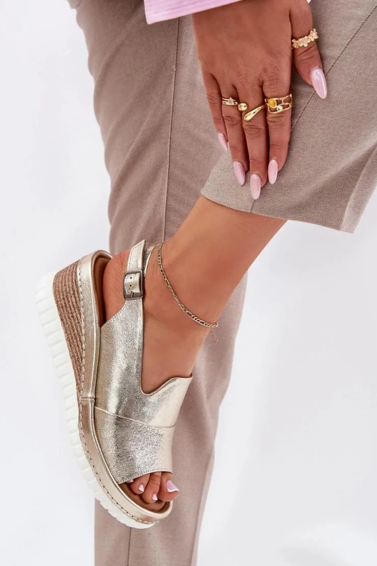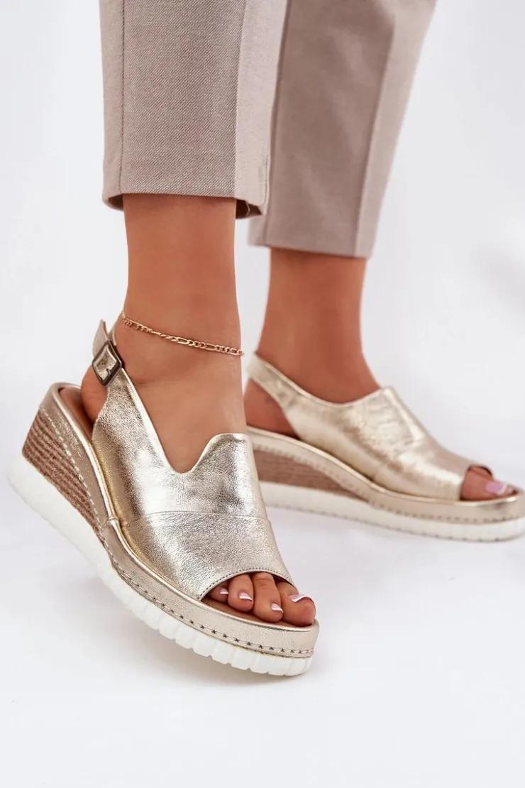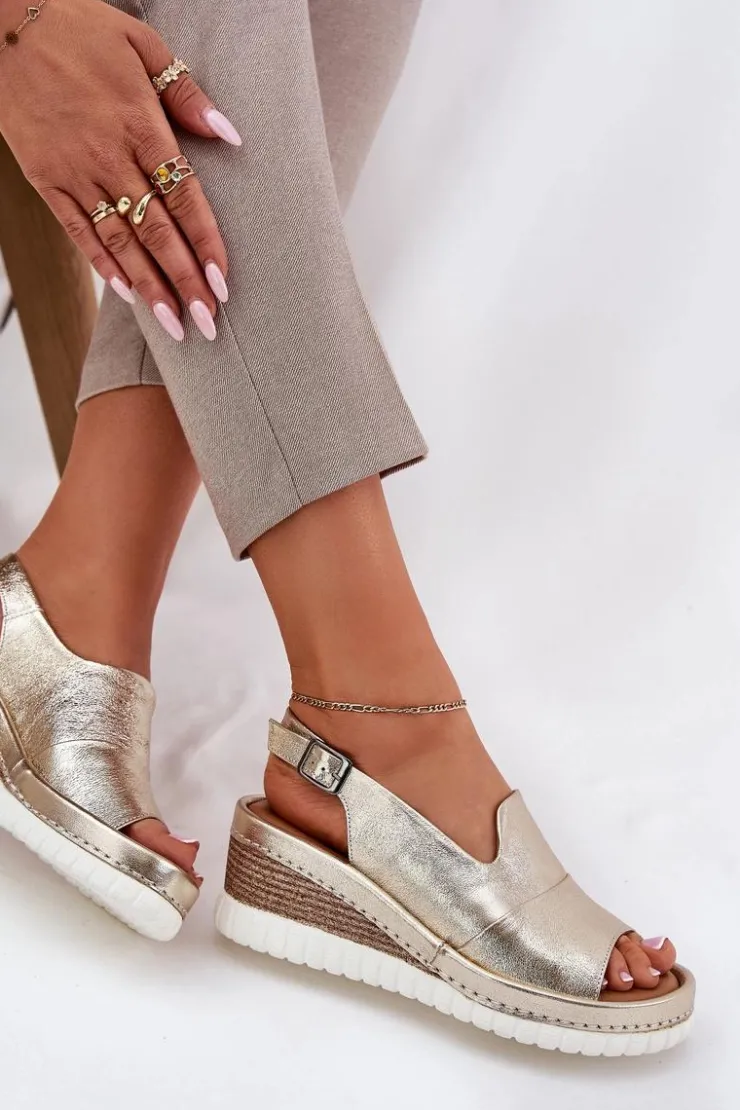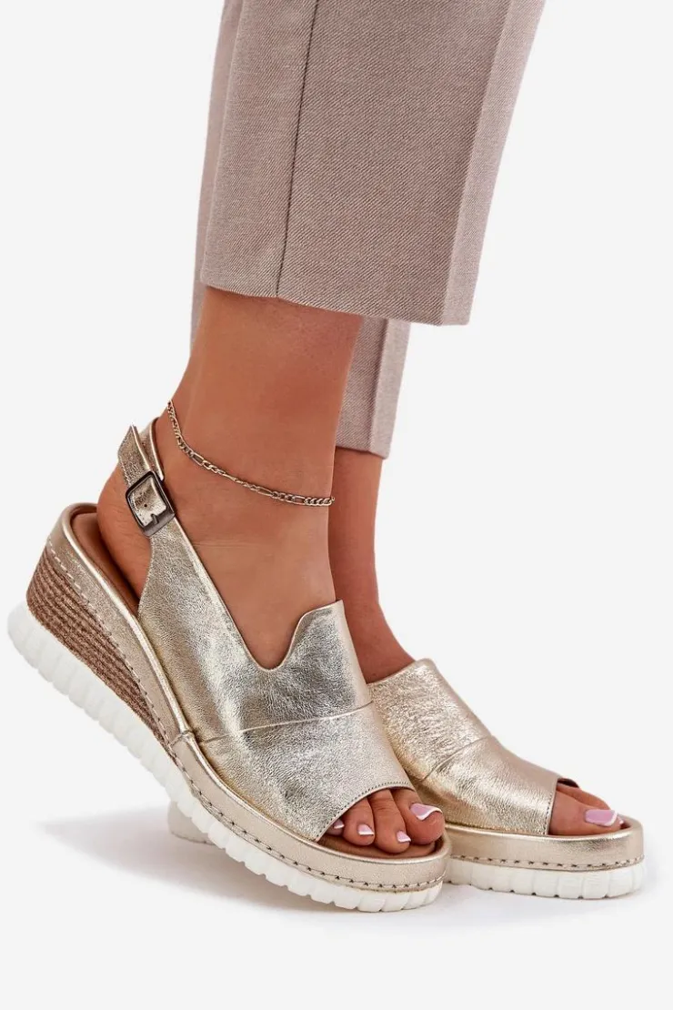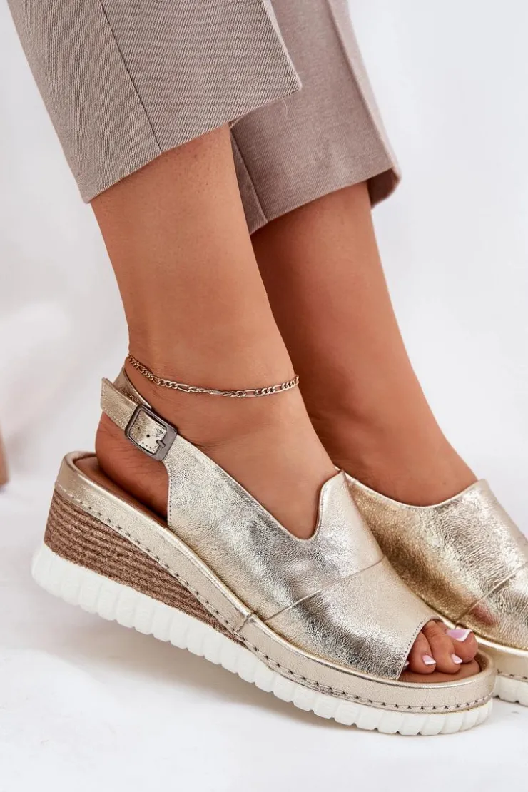 Damskie sandały z naturalnej skóry to elegancka opcja na ciepłe dni. Osadzone na koturnie, zapewniają stabilność i komfort przez cały dzień. Zapinane na klamrę z regulowanym paskiem, pozwalają na idealne dopasowanie do stopy. Miękka wkładka gwarantuje wygodę, a klasyczny fason sprawia, że te sandały będą doskonałym wyborem do sukienek i spodni materiałowych, nadając stylizacji lekkości i elegancji. Przy wyborze rozmiaru prosimy sugerować się tabelą rozmiarów.