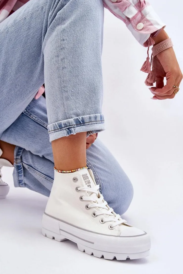 Modne, wysokie trampki damskie od marki Big Star! Podeszwa z wysokim bieżnikiem oraz cholewka wykonana z materiału tekstylnego za kostkę. Trampki te dodatkowo posiadają delikatnie usztywniany zapiętek. Platforma wraz z podeszwą zostały wykonane z gumowego tworzywa. Przy wyborze rozmiaru prosimy sugerować się tabelą rozmiarów.