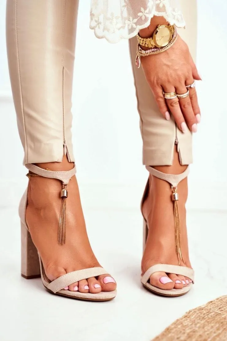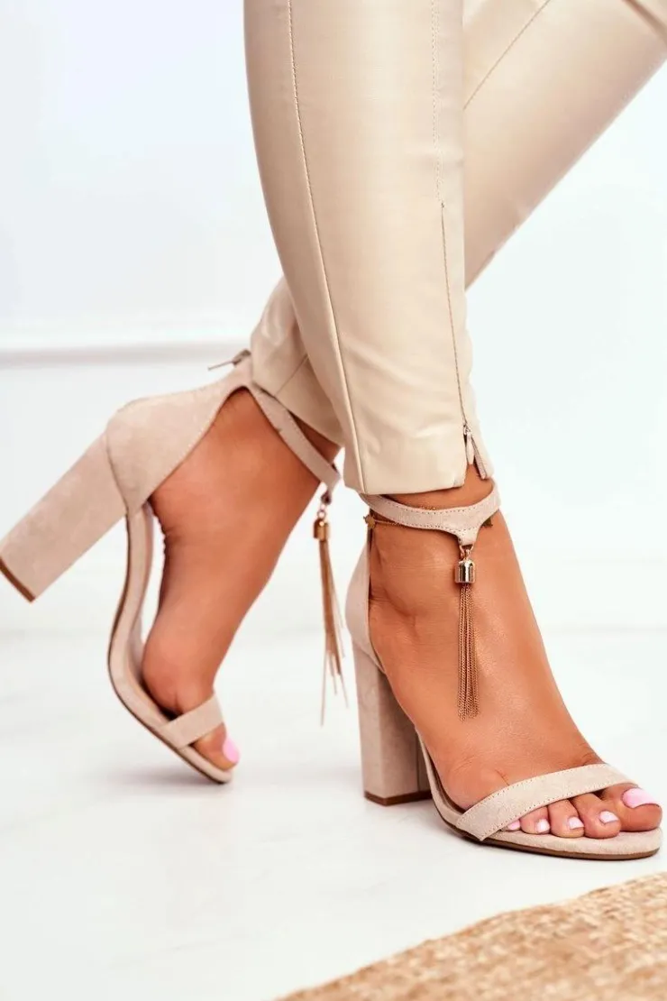 Best Boto Beżowe Zamszowe Sandałki na Słupku z Frędzlem Annick