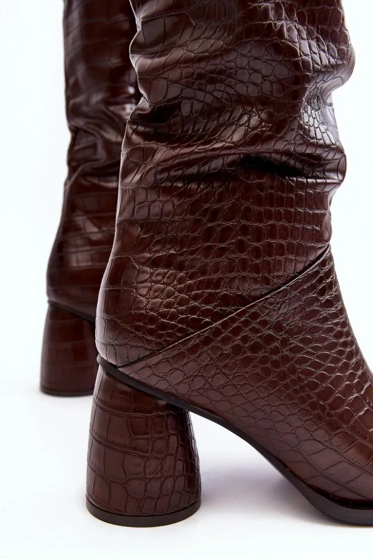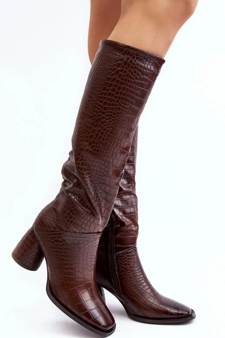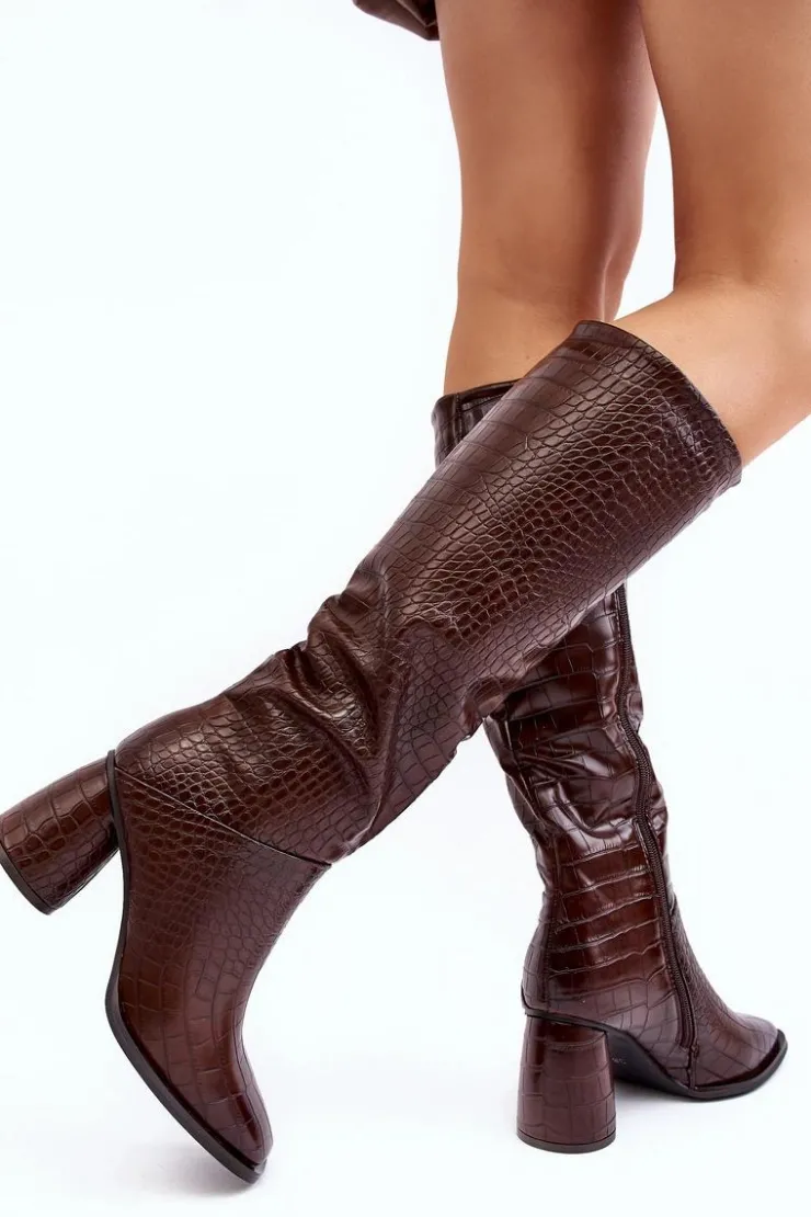 Kozaki damskie z cholewką do kolana w wężowy wzór. Osadzone na obcasie słupku. Wykonane z eko skóry. Zapinane na suwak z boku. Środek ocieplony kocem obuwniczym. Noski w kwadrat. Wykorzystasz je w wielu stylizacjach! Przy wyborze rozmiaru prosimy sugerować się tabelą rozmiarów.