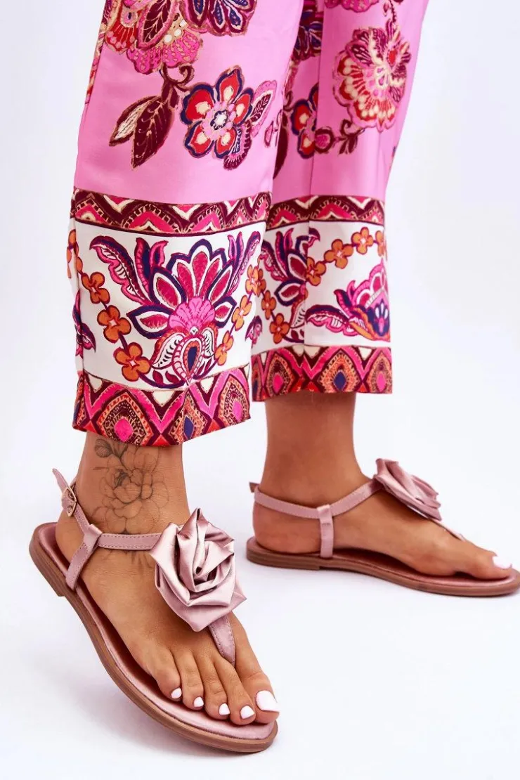 Damskie sandałki zostały wykonane z materiału tekstylnego imitującego satynę. Ozdobione na środku dużą, materiałową różą. Sandałki w stylu japonek osadzono na płaskim obcasie. Zapinane są na regulowany pasek ze sprzączką. Miękka wkładka została wykonana z materiału. Przy wyborze rozmiaru prosimy kierować się tabelą rozmiarów.