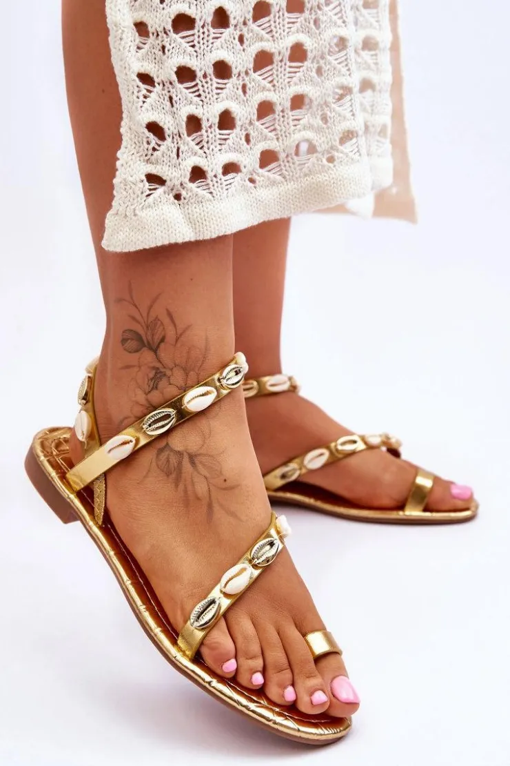 Modne sandały damskie wykonane z eko skóry z ozdobnymi muszelkami. Model ten jest niezwykle przewiewny i komfortowy w użytkowaniu, a także klasycznie wsuwany. Miękka, eko skórzana wkładka świetnie sprawdzi się podczas użytkowania. Sandałki osadzono na płaskim obcasie.Przy wyborze rozmiaru prosimy kierować się tabelą rozmiarów.