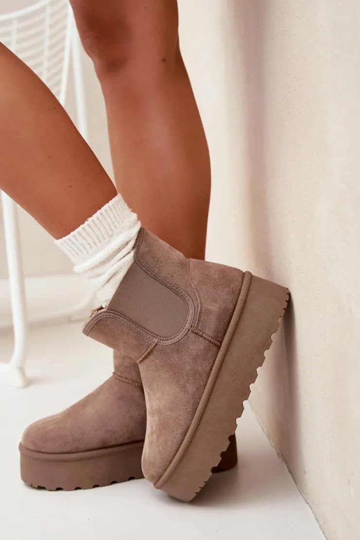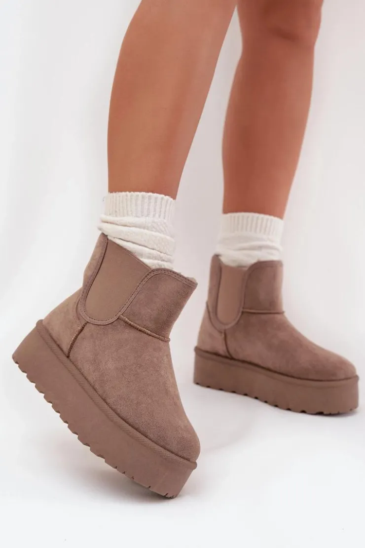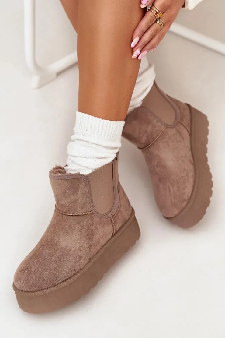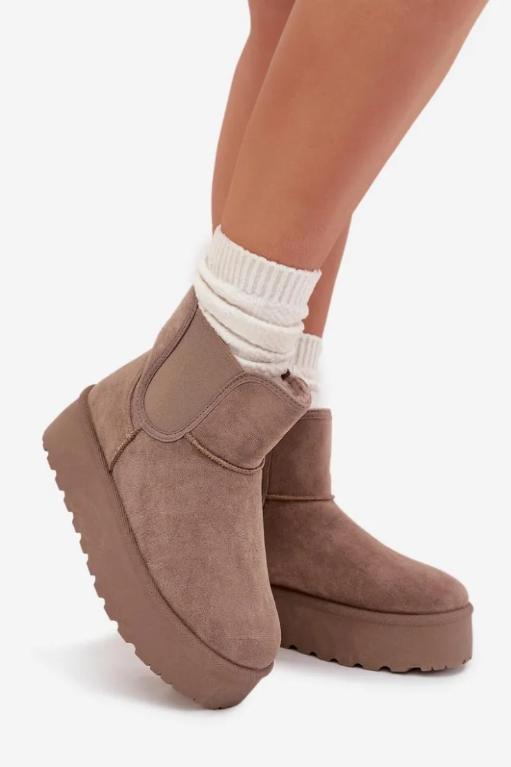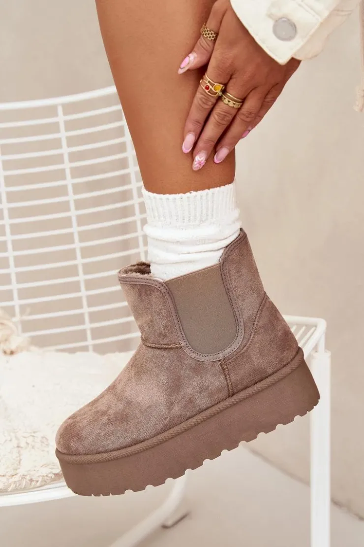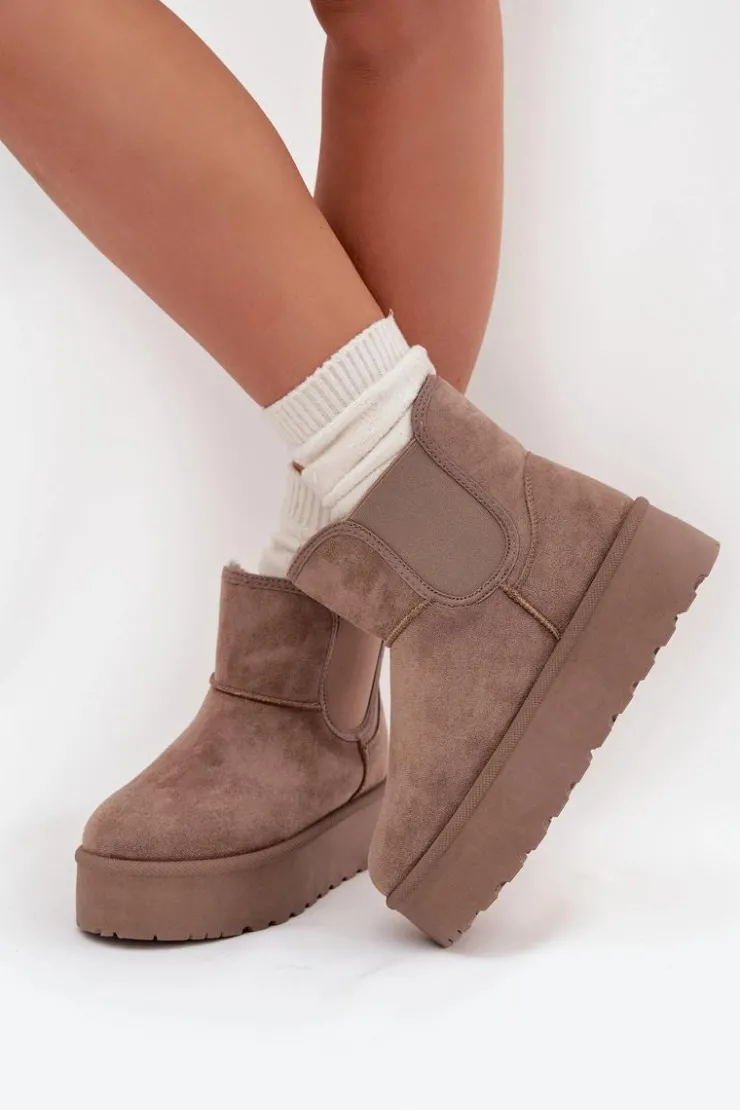 Modne śniegowce damskie osadzone na platformie, która skutecznie izoluje od zimnego podłoża, to doskonały wybór na zimowe dni. Wykonane z eko zamszu, zapewniają elegancki wygląd, a elastyczne wstawki w cholewce gwarantują wygodę i dopasowanie. Ocieplenie grubym futerkiem zapewnia ciepło nawet w najchłodniejsze dni. Ten stylowy fason doskonale komponuje się z różnymi zimowymi stylizacjami. Przy wyborze rozmiaru prosimy sugerować się tabelą rozmiarów.