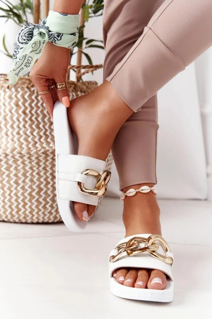 Gumowe klapki damskie z ozdobnym łańcuchem. Cholewka wykonana jest z eko skóry. Koniecznie sprawdź całą naszą kolekcję klapek damskich! Przy wyborze rozmiaru prosimy sugerować się tabelą rozmiarów.