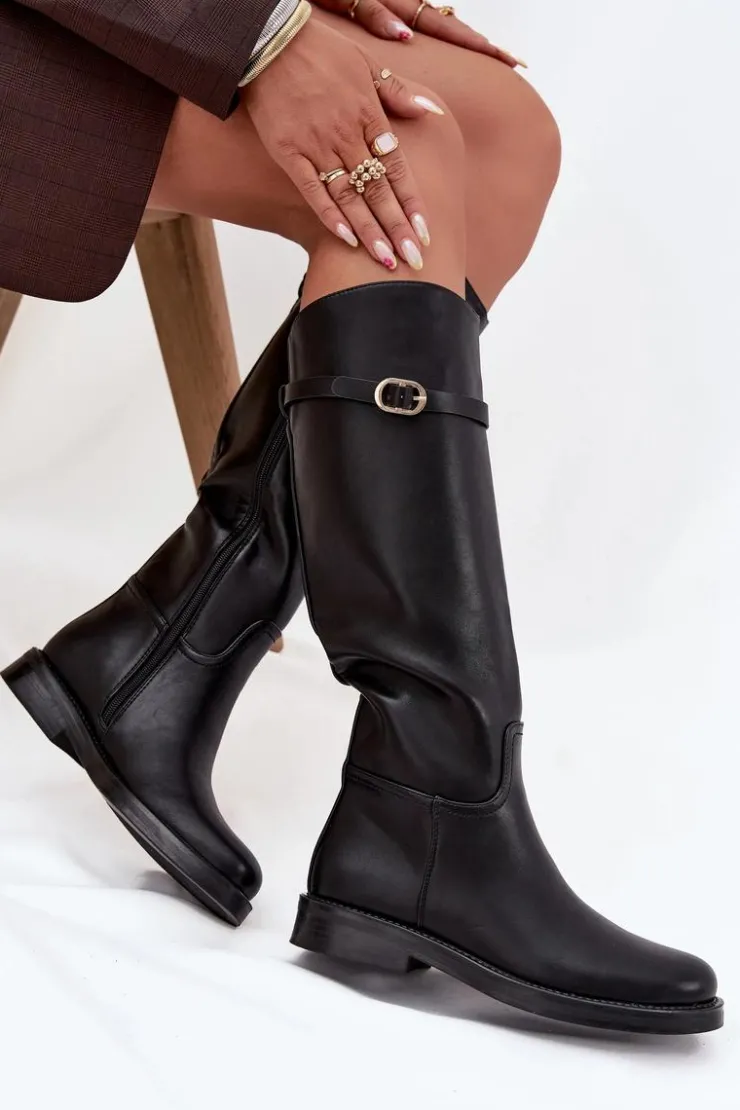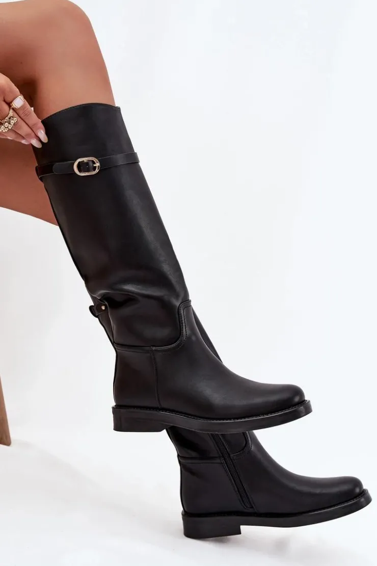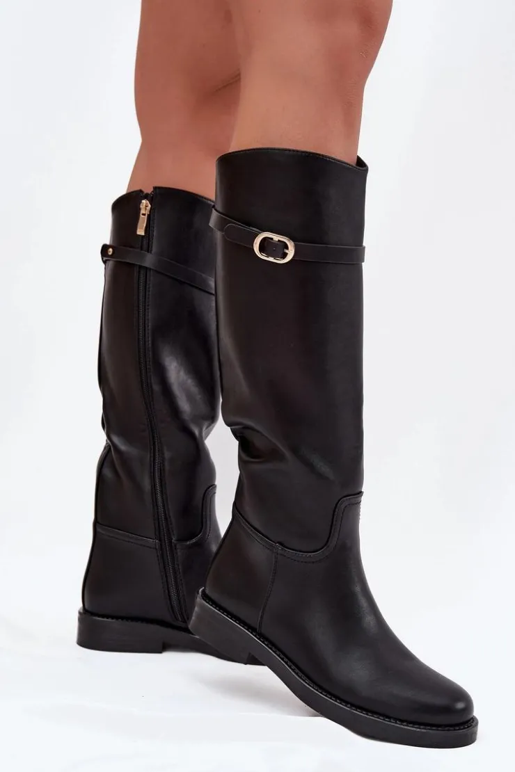 Kozaki damskie z eko skóry to połączenie prostoty i subtelnego stylu. Osadzone na płaskim obcasie, zapewniają wygodę przy codziennym noszeniu, a zamek ułatwia szybkie zakładanie. Wnętrze ocieplone na wysokości stopy gwarantuje komfort w chłodniejsze dni. Dodatkowo cienki paseczek ze złotą klamrą, który można odpiąć, wprowadza elegancki akcent i pozwala na drobną zmianę stylu w zależności od okazji. Przy wyborze rozmiaru prosimy kierować tabelą rozmiarów.
