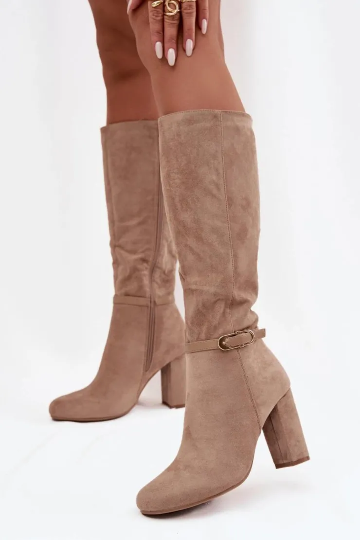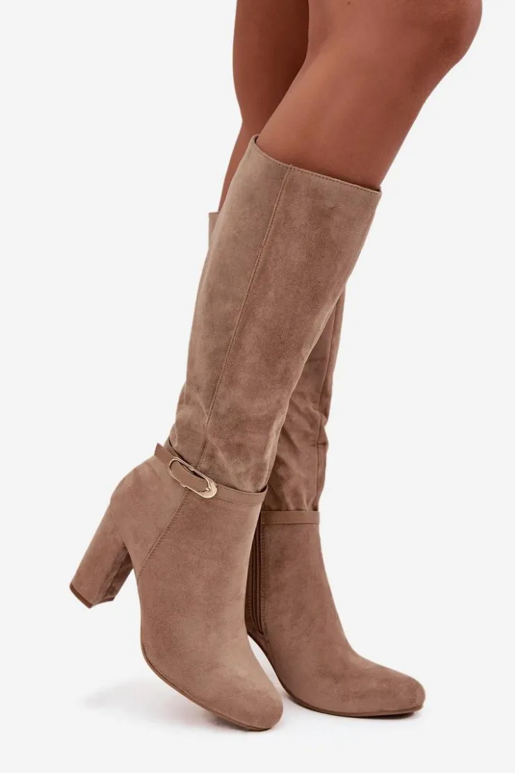 Kozaki damskie wykonane z eko zamszu to elegancka propozycja, która świetnie sprawdzi się w sezonie jesienno-zimowym. Klasyczny fason został urozmaicony subtelnym paseczkiem ze złotą klamrą umieszczonym na cholewce, co nadaje całości szyku i kobiecego charakteru. Model osadzony został na stabilnym obcasie typu słupek, który wysmukla sylwetkę, a jednocześnie zapewnia wygodę podczas noszenia. Zaokrąglone noski podkreślają ponadczasowy styl butów, a wnętrze ocieplone miękkim kocem obuwniczym gwarantuje komfort i ciepło w chłodniejsze dni. To kozaki, które doskonale dopełnią eleganckie stylizacje, ale równie dobrze sprawdzą się w codziennym wydaniu. Przy wyborze rozmiaru prosimy sugerować się tabelą rozmiarów.