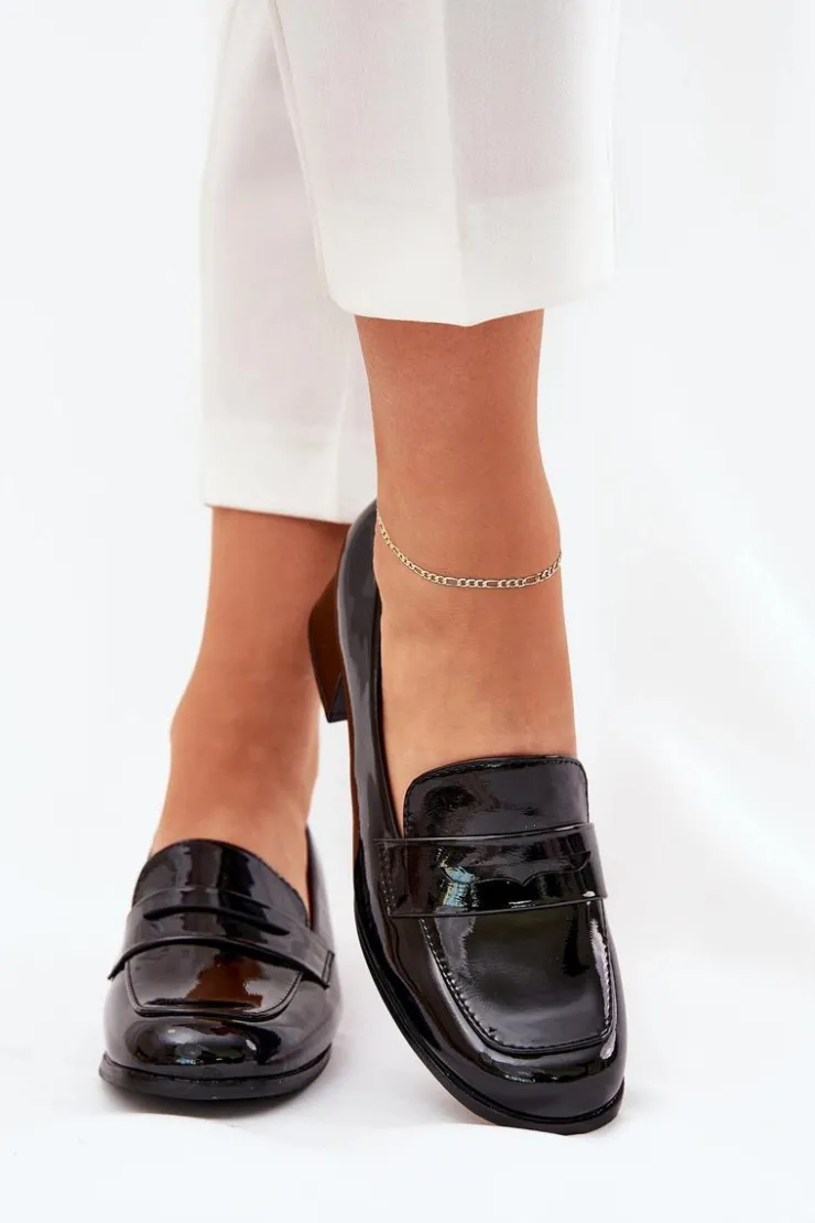 Czółenka z lakierowanej eko skóry, osadzone na niskim obcasie. Noski zaokrąglone zapewniają komfort przez cały dzień, a miękka wkładka dodaje dodatkowej wygody. Z przodu znajduje się paseczek z wycięciem. Te czółenka będą doskonałym wyborem na co dzień, pasując do eleganckich oraz casualowych stylizacji. Przy wyborze rozmiaru prosimy kierować się tabelą rozmiarów