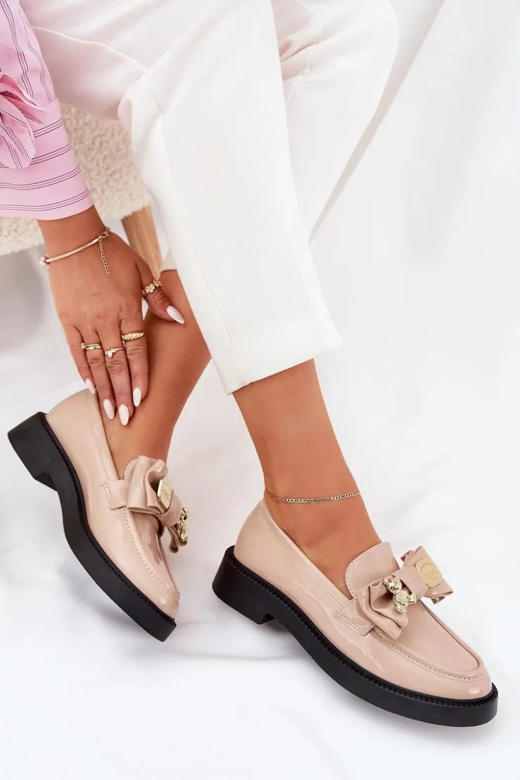 Modne mokasyny z eko skóry, które łączą elegancję z urokiem detali. Model posiada kokardkę z ozdobną broszką, która zdobi buty napisem i misiem, nadając im wyjątkowego charakteru. Zaokrąglone noski zapewniają komfort przez cały dzień, a klasyczny fason sprawia, że te mokasyny będą doskonałym wyborem do wielu stylizacji. Idealne na co dzień, łączą wygodę z modnym wyglądem. Przy wyborze rozmiaru prosimy sugerować się tabelą rozmiarów.