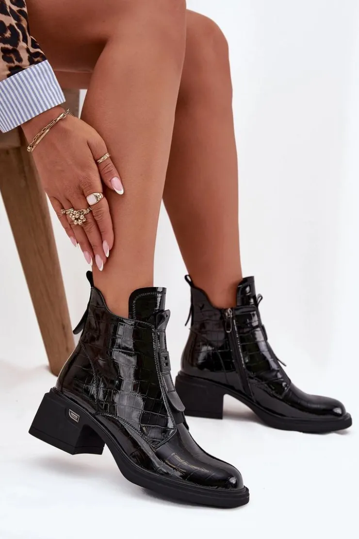 Botki damskie wykonane z lakierowanej skóry to połączenie elegancji i nowoczesnego stylu. Model osadzony na niskim obcasie typu klocek zapewnia stabilny i wygodny krok przez cały dzień, dzięki czemu świetnie sprawdzi się zarówno w pracy, jak i podczas codziennych aktywności. Botki są delikatnie ocieplane, co zapewnia komfort w chłodniejsze dni, nie obciążając przy tym stopy. Zamek z boku ułatwia szybkie zakładanie i zdejmowanie, a subtelne tłoczenie oraz mała ozdoba z przodu cholewki dodają butom wyjątkowego charakteru, wprowadzając elegancki, kobiecy akcent. To idealna propozycja dla pań, które cenią klasykę połączoną z modnymi detalami, pasującymi zarówno do casualowych, jak i bardziej formalnych stylizacji. Przy wyborze rozmiaru prosimy sugerować się tabelą rozmiarów.