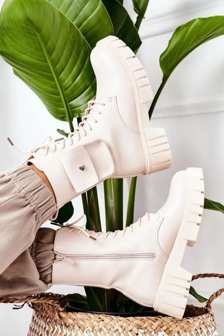 Botki damskie wykonane ze skóry ekologicznej ozdobione modną kieszonką. Wnętrze butów ocieplone jest miłym w dotyku kocem obuwniczym. Przy wyborze rozmiaru prosimy sugerować się tabelą rozmiarów.