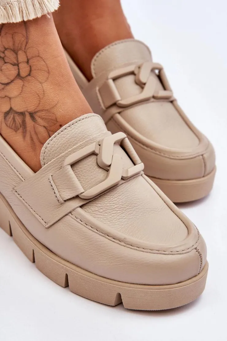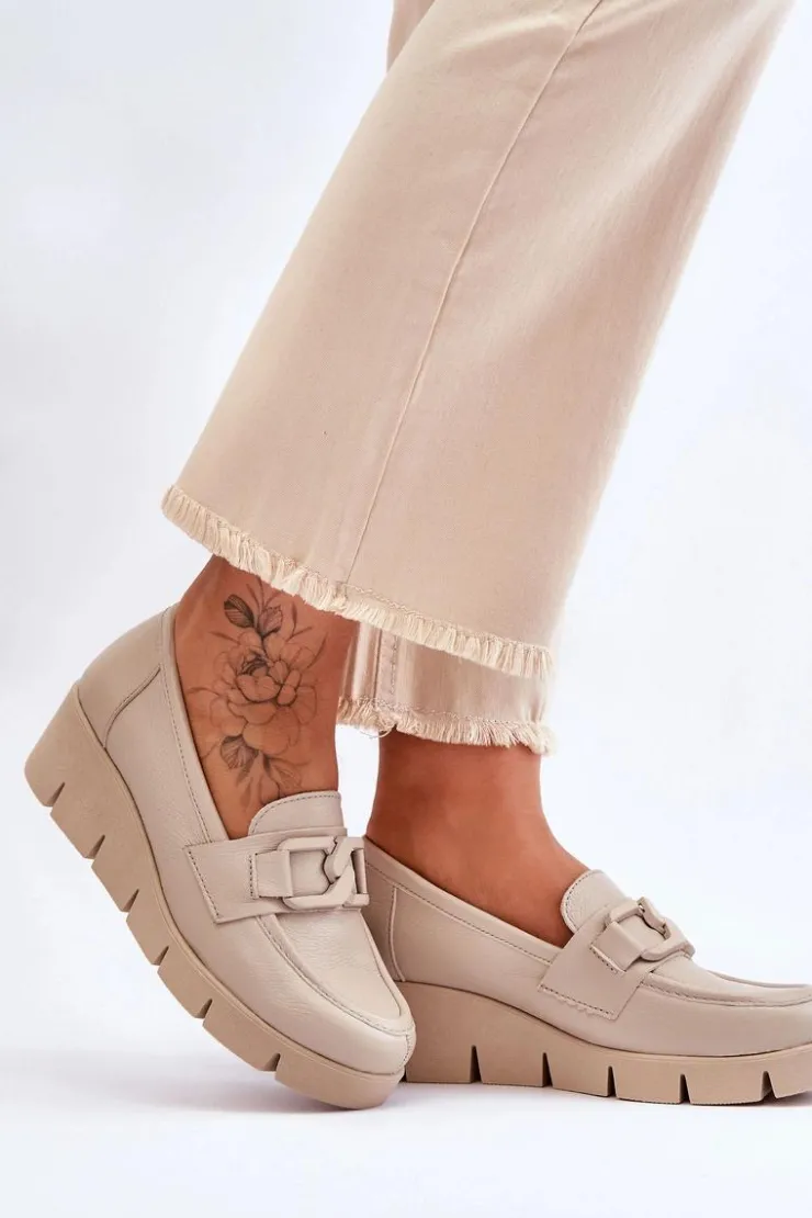 Wygodne mokasyny damskie zostały wykonane z naturalnej skóry. Posiadają ozdobę na przodzie cholewki. Zapiętek w tych butach został usztywniony, co pozwoli na odpowiednią stabilizację stopy. Mokasyny są osadzone na koturnie oraz platformie. Świetny model do wielu stylizacji! Przy wyborze rozmiaru prosimy sugerować się tabelą rozmiarów.