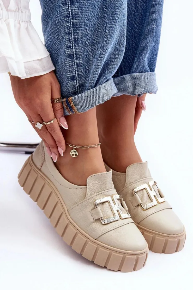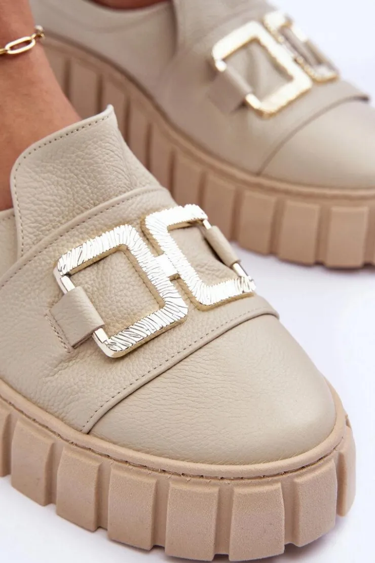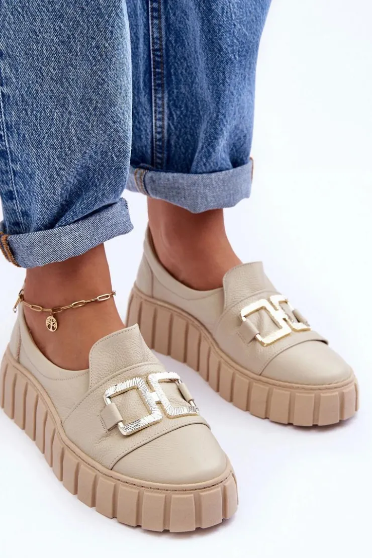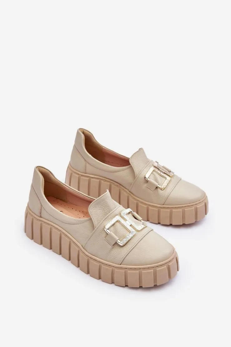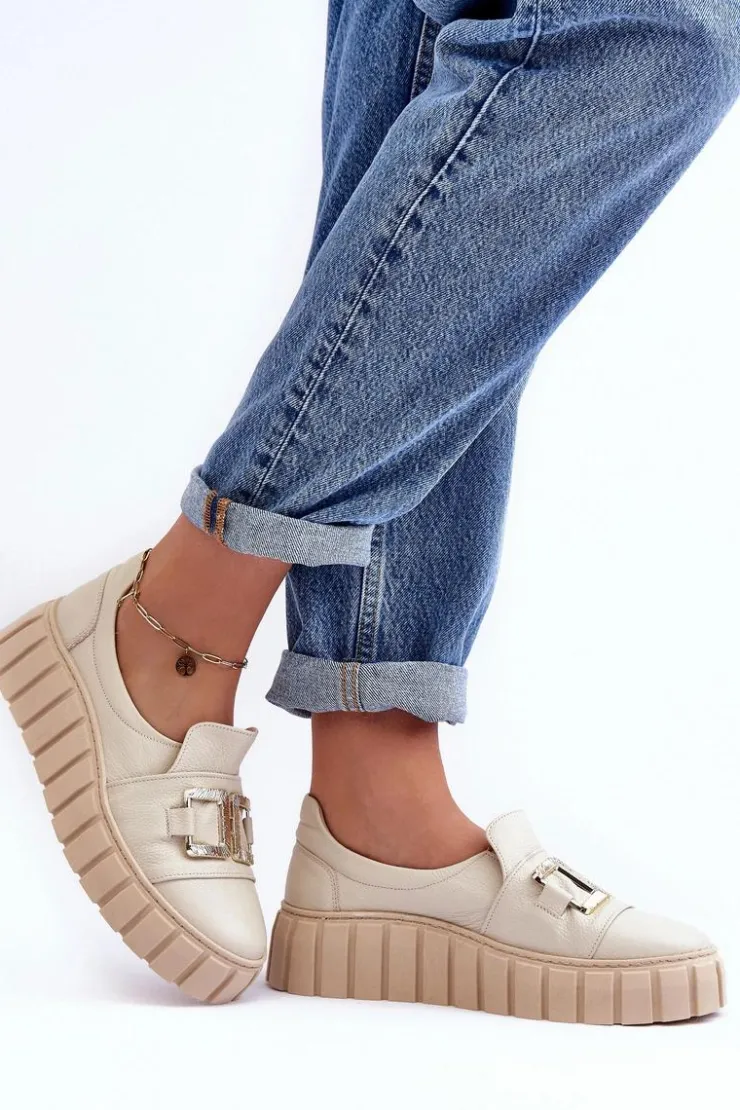 Best Boto Skórzane Półbuty Damskie Na Platformie Beżowe Lewski 3398 Beżowy