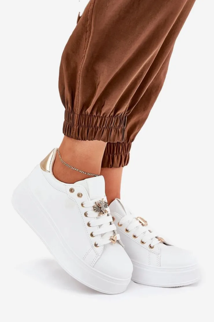 Damskie sneakersy wykonane z ekologicznej skóry. Umieszczone na platformie, zapewniają subtelne podwyższenie oraz komfort użytkowania. Posiadają zaokrąglone noski, które nadają im klasyczny wygląd. Ozdobne przypinki na sznurowadłach dodają unikalnego charakteru i dziewczęcego uroku. Ten model świetnie sprawdzi się zarówno w codziennych, jak i bardziej casualowych stylizacjach, stanowiąc eleganckie uzupełnienie każdej garderoby. Przy wyborze rozmiaru prosimy kierować tabelą rozmiarów.