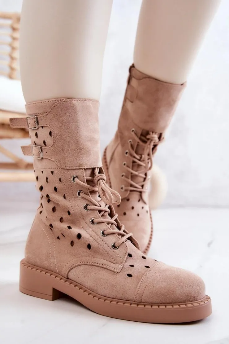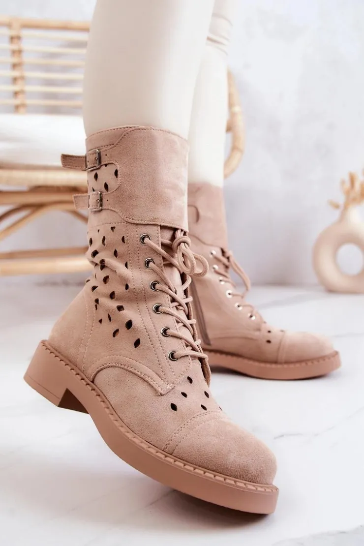Buty zostały wykonane z eko zamszu. Wysokie botki posiadają zapinanie na suwak, wiązanie ułatwiające dopasowanie obuwia do tęgości nogi oraz regulowane paski zapinane na sprzączkę. Model ażurowy świetnie wpisze się w wiosenno-letnie stylizacje. Płaski obcas zapewni stabilność na każdym kroku.Przy wyborze rozmiaru prosimy sugerować się tabelą rozmiarów.