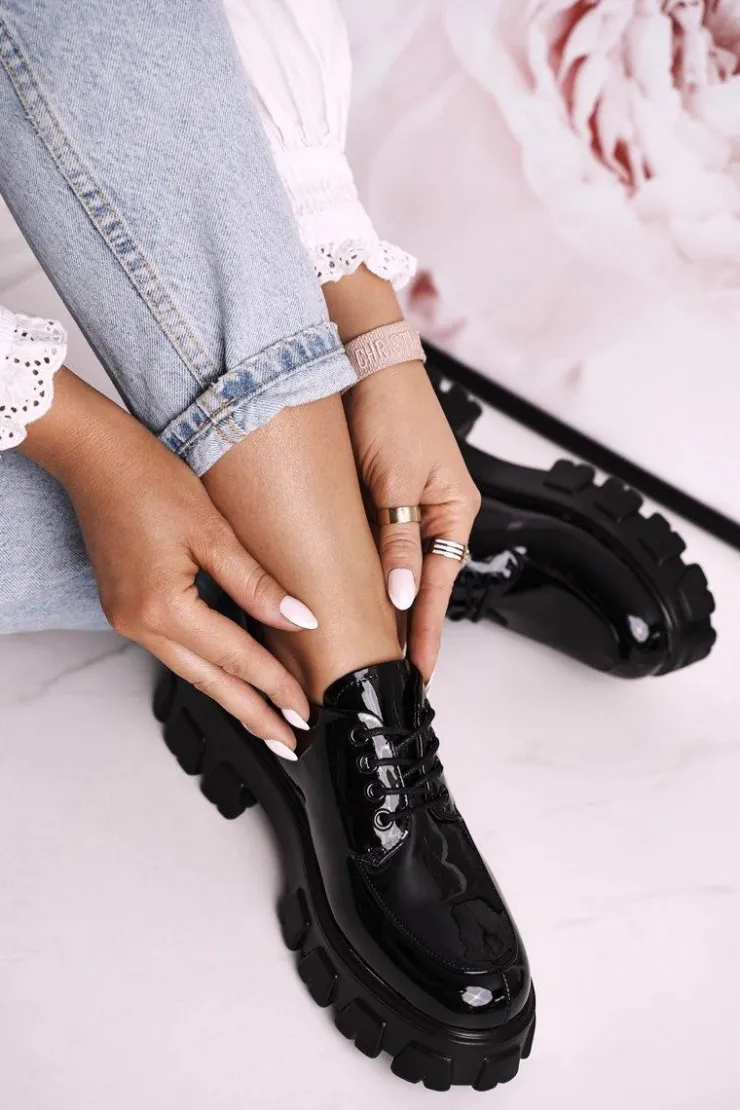 Best Damskie buty S.Barski Damskie Półbuty Oxfordy Na Masywnej Platformie S.Barski HX23 Lakierowane Czarne