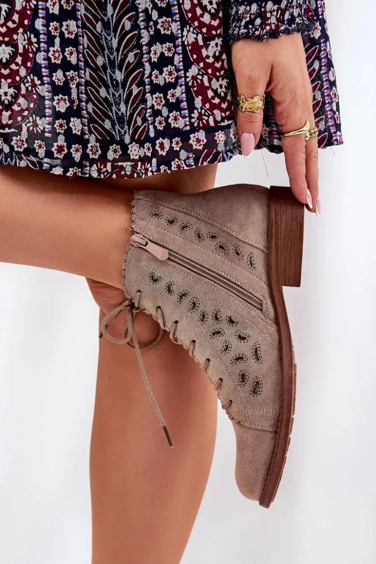 Botki damskie z eko zamszu to stylowa propozycja na chłodniejsze dni. Niska cholewka ozdobiona ażurowym wzorem nadaje im lekkości. Sznurowane i zapinane na zamek, co zapewnia łatwość zakładania oraz dopasowanie do stopy. Te botki będą doskonałym wyborem do codziennych stylizacji, łącząc funkcjonalność z modnym wyglądem.Przy wyborze rozmiaru prosimy sugerować się poniższą tabelą rozmiarów.