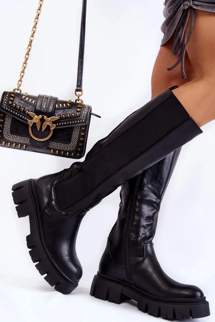 Modne, damskie kozaki zostały wykonane z wysokiej jakości eko skórzanych materiałów. Posiadają suwak na całej długości cholewki oraz usztywniany zapiętek. Dodatkowo po zewnętrznej stronie znajduje się elastyczna wstawka. Kozaki zostały osadzone na płaskim obcasie i platformie ze żłobieniami. Model do kolana. Fason ten posiada ocieplenie w postaci miłego w dotyku, krótkiego futerka. Klasyczny fason sprawdzi się do wielu stylizacji! Przy wyborze rozmiaru prosimy kierować tabelą rozmiarów.