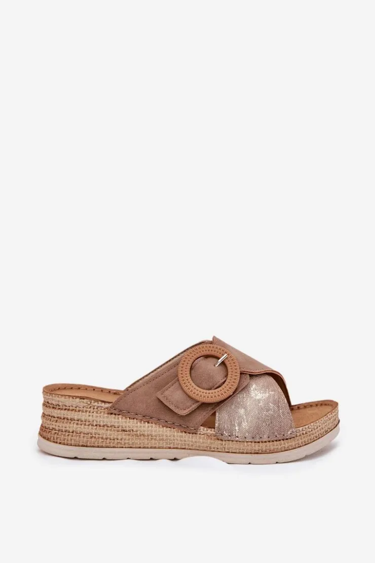 Klapki damskie od marki Inblu, osadzone na koturnie, to doskonały wybór na ciepłe dni. Wkładka z naturalnego zamszu zapewnia komfort i wygodę, a ozdobna klamra dodaje im eleganckiego charakteru. Lekkie i wygodne, stanowią idealne uzupełnienie codziennych stylizacji, łącząc funkcjonalność z modnym wyglądem. Przy wyborze rozmiaru prosimy sugerować się tabelą rozmiarów.