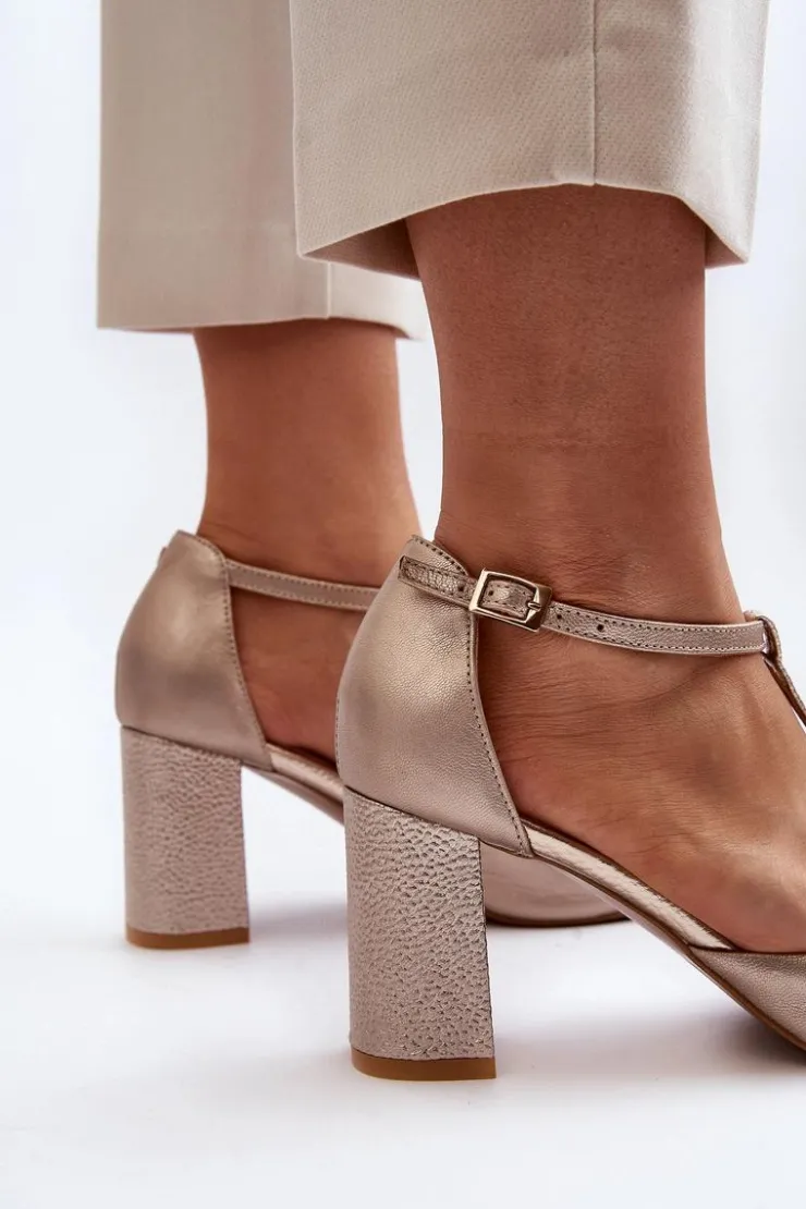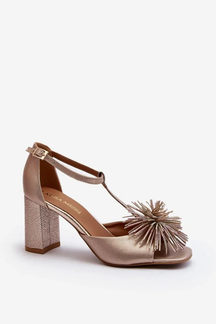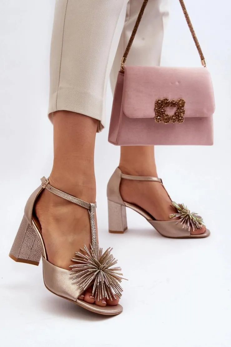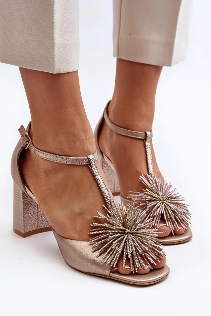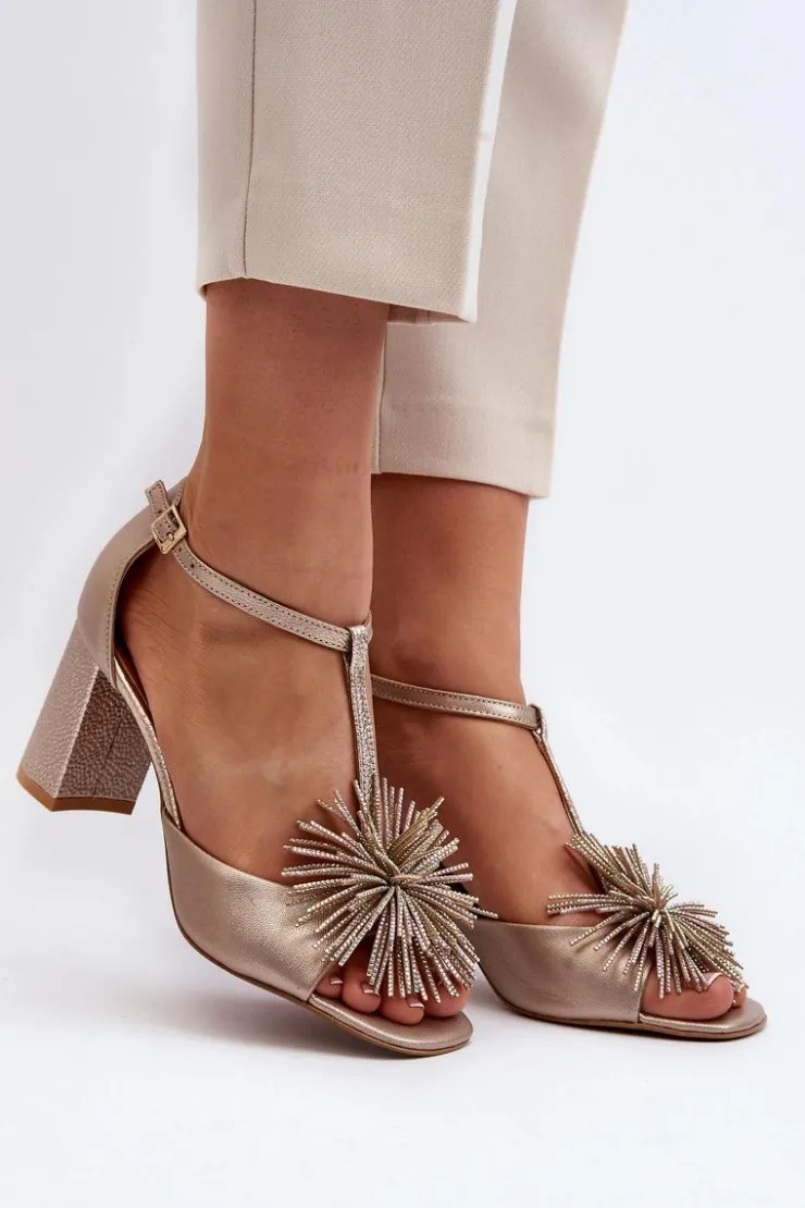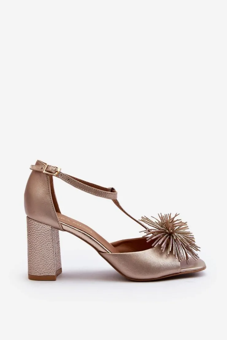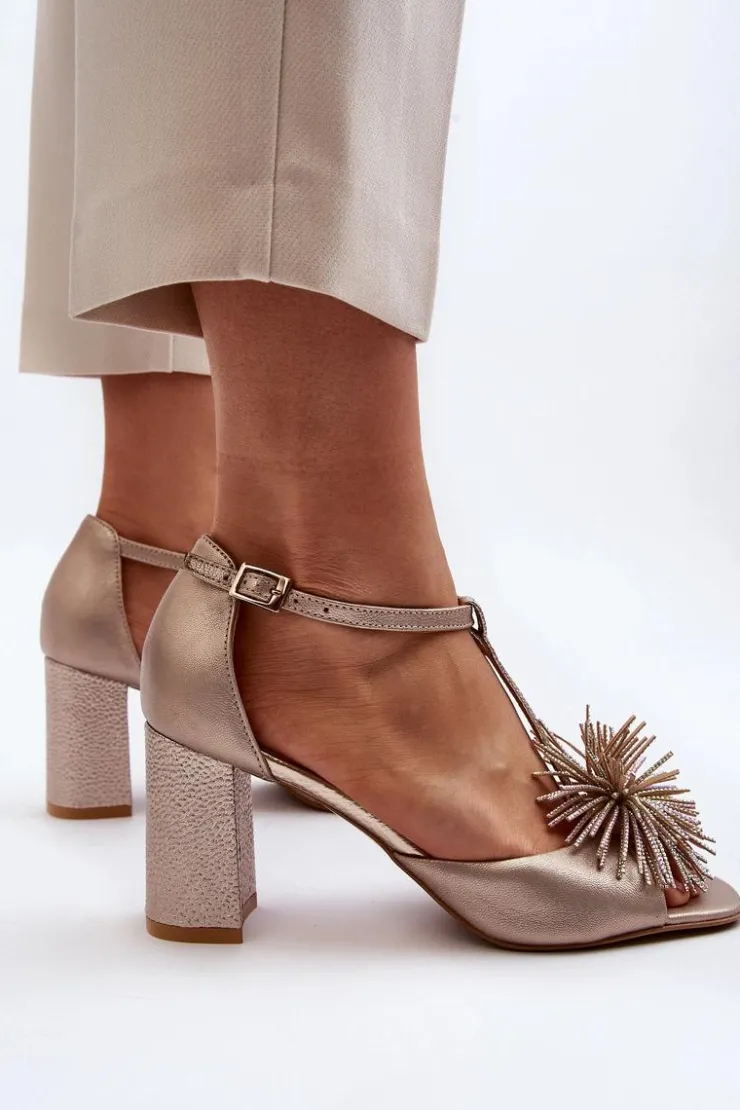 Sandały damskie wykonane ze skóry naturalnej. Osadzone na obcasie w postaci słupka. Zapinane na regulowany paseczek ze sprzączką. Model z zakrytą piętą. Z przodu ozdoba. Skórzana wkładka zapewni wygodę podczas użytkowania. Fason ten dopasujesz do eleganckich spodni, spódnic i sukienek. Przy wyborze rozmiaru prosimy sugerować się tabelą rozmiarów.