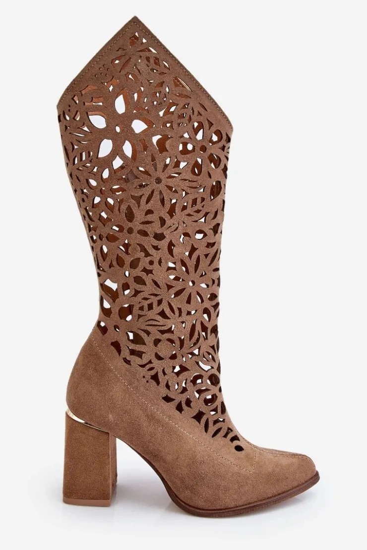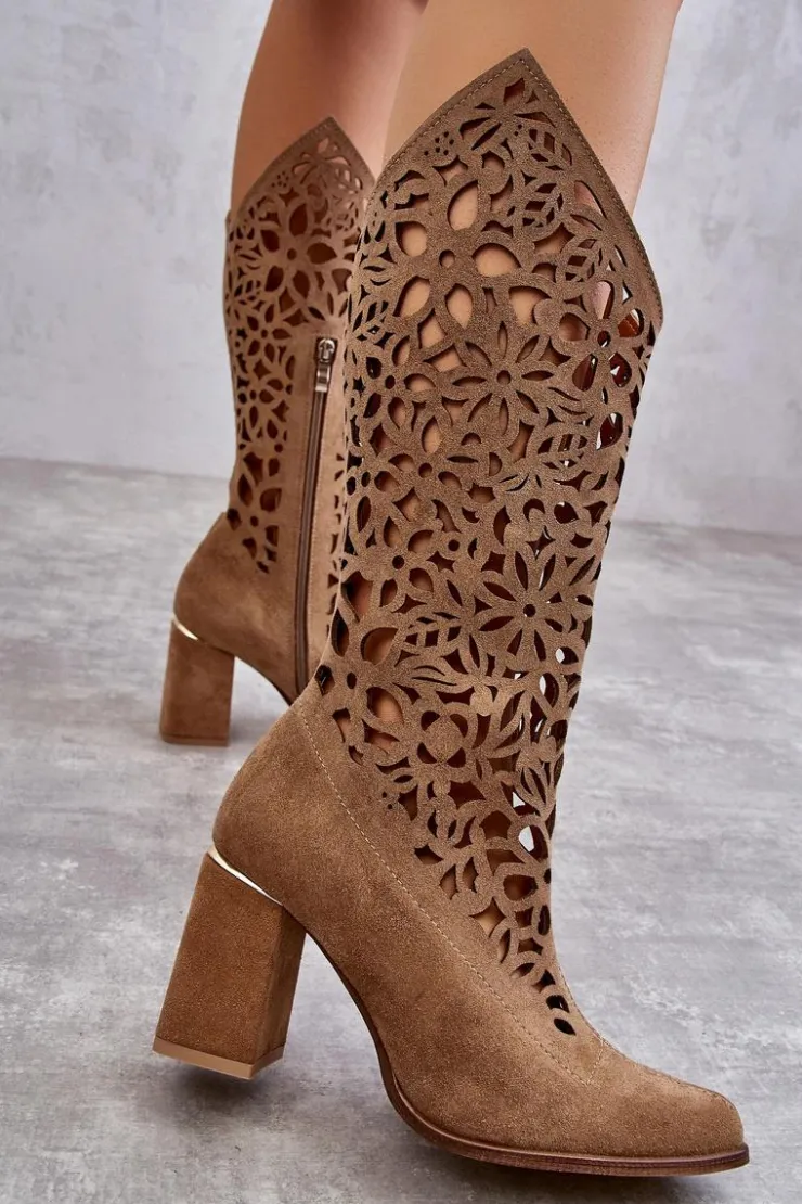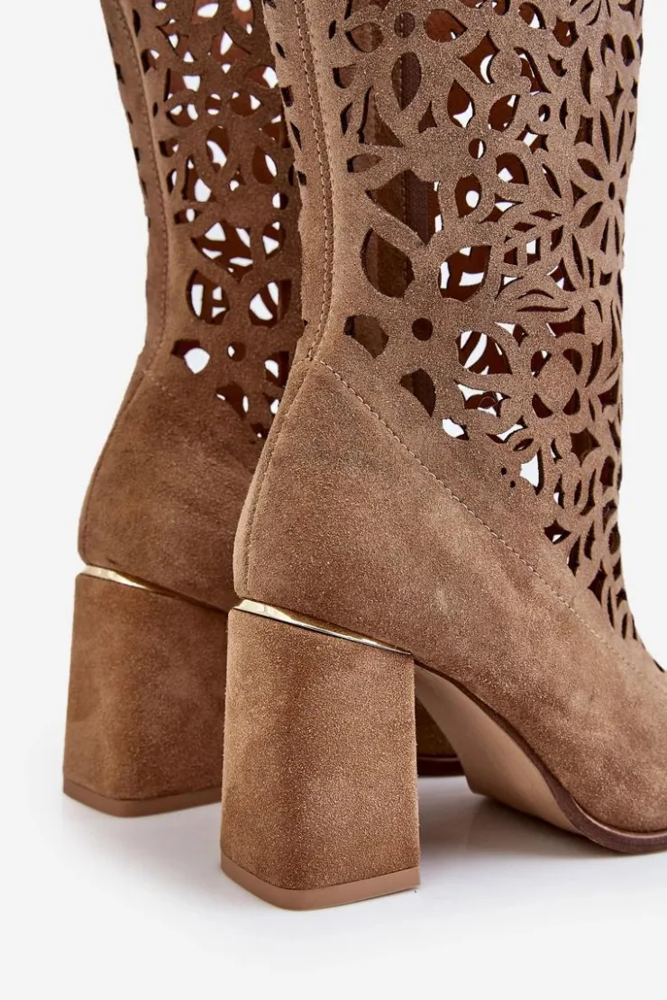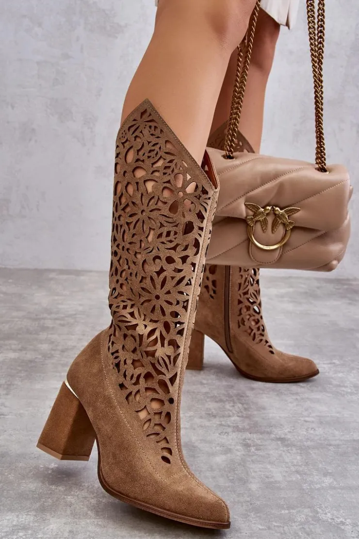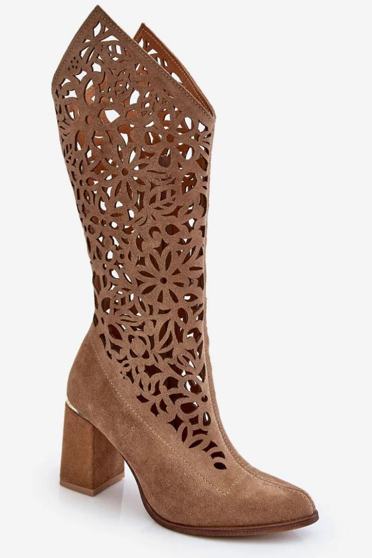 Kozaki z ażurową cholewką do kolana oraz noskiem w szpic. Zapinane na zamek błyskawiczny oraz wsuwane. Posiadają usztywniany zapiętek. Wykonane z wysokiej jakości skór naturalnych. Z tymi kozakami stworzysz wiele ciekawych stylizacji na co dzień. Miękka, skórzana wkładka oraz stabilny obcas w postaci słupka zapewnią wygodę podczas użytkowania. Przy wyborze rozmiaru prosimy sugerować się tabelą rozmiarów.