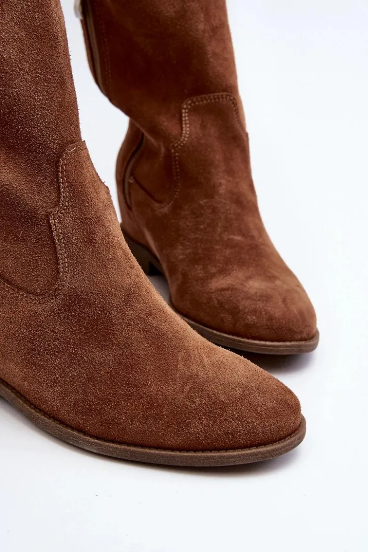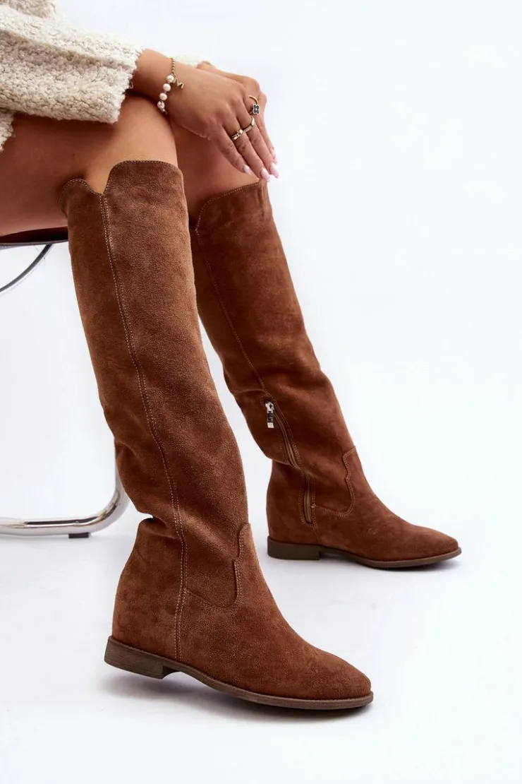 Kozaki damskie zostały wykonane z wysokiej jakości naturalnego zamszu. Osadzone na płaskim obcasie oraz ukrytym koturnie. Cholewka do kolana z wycięciami na bokach. Noski zaokrąglone. Środek lekko ocieplony kocem obuwniczym. Ten modny fason świetnie sprawdzi się w wielu wiosenno-jesiennych stylizacjach! Przy wyborze rozmiaru prosimy sugerować się tabelą rozmiarów.