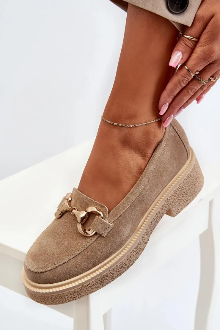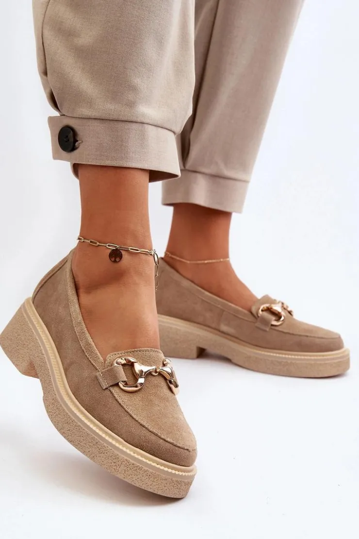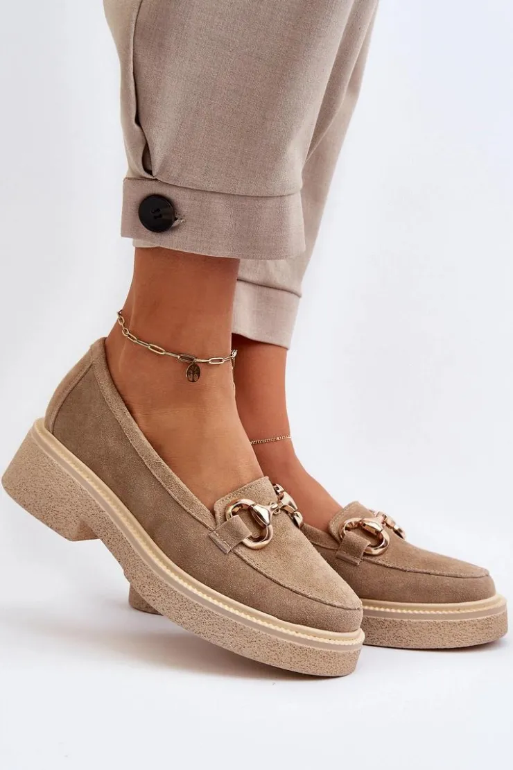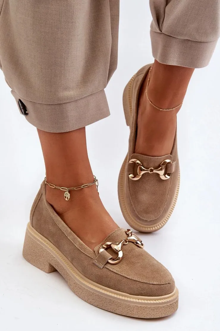 Te eleganckie mokasyny damskie wykonane z naturalnego zamszu są nie tylko wyjątkowo stylowe, ale także niezwykle wygodne. Ich przód ozdobiony jest złotą ozdobą, która dodaje im nutę luksusu i elegancji. Osadzone na platformie i płaskim obcasie. Profilowana wkładka zapewni wygodę podczas użytkowania. Niezwykle modny fason, który wykorzystasz do wielu stylizacji! Przy wyborze rozmiaru prosimy sugerować się tabelą rozmiarów.