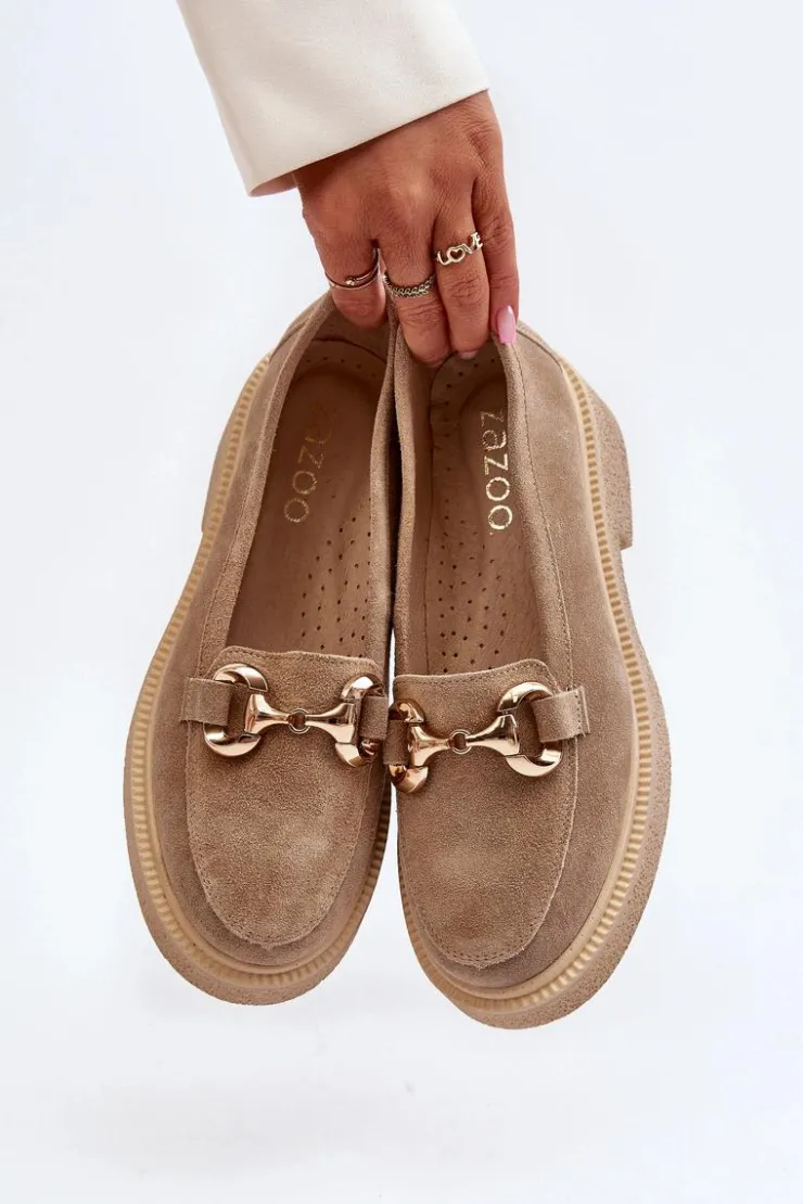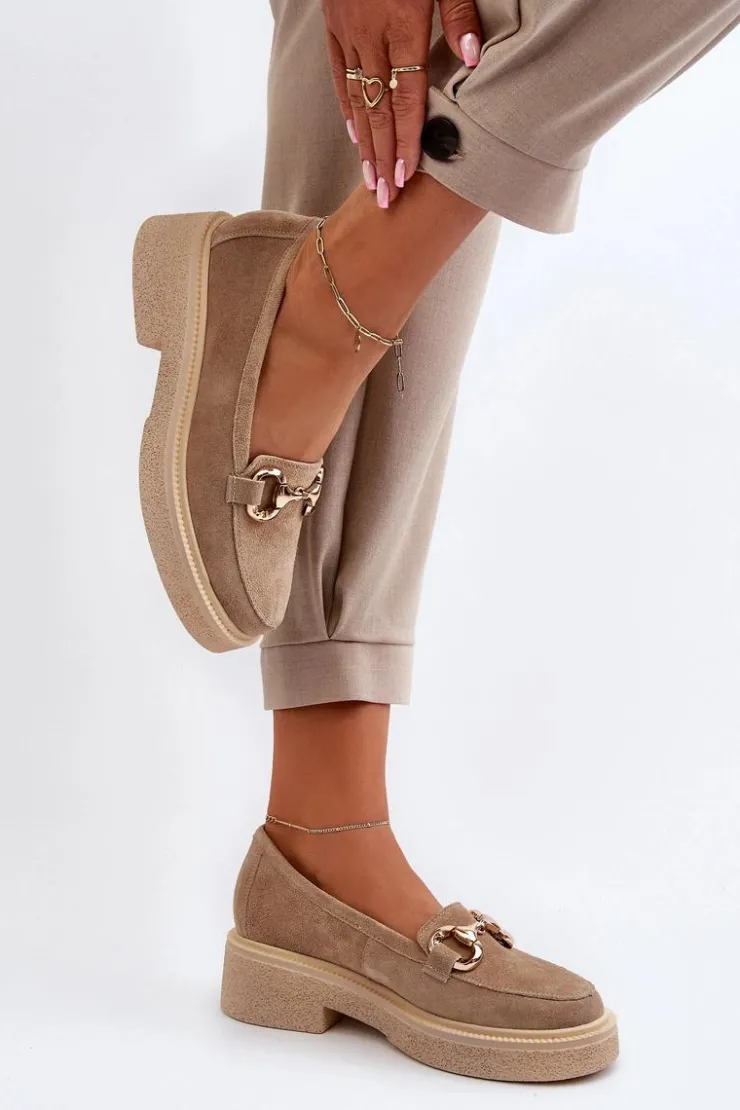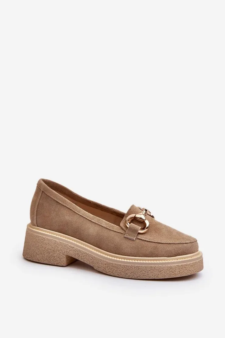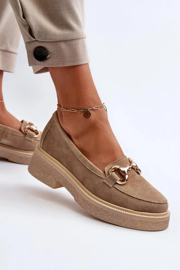 Te eleganckie mokasyny damskie wykonane z naturalnego zamszu są nie tylko wyjątkowo stylowe, ale także niezwykle wygodne. Ich przód ozdobiony jest złotą ozdobą, która dodaje im nutę luksusu i elegancji. Osadzone na platformie i płaskim obcasie. Profilowana wkładka zapewni wygodę podczas użytkowania. Niezwykle modny fason, który wykorzystasz do wielu stylizacji! Przy wyborze rozmiaru prosimy sugerować się tabelą rozmiarów.