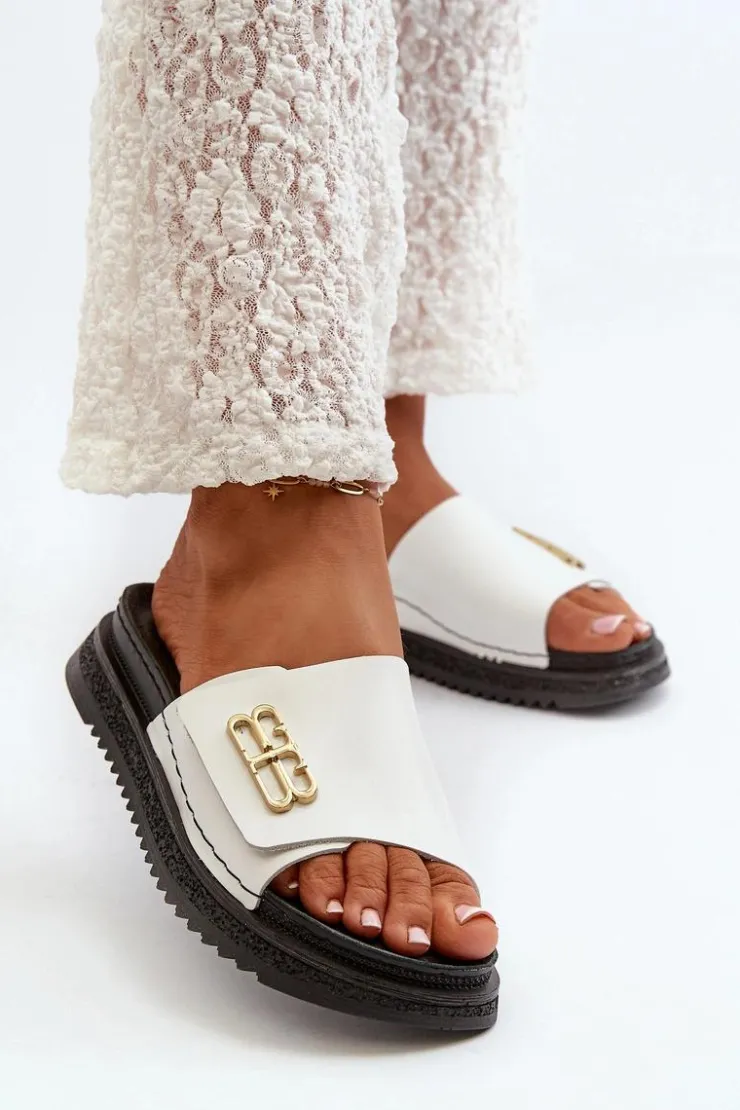Klapki damskie wykonane ze skóry naturalnej. Osadzone na platformie. Pasek ozdobiony złotym detalem dodaje im elegancji. Idealne na letnie dni, te klapki doskonale dopełnią każdą stylizację, łącząc funkcjonalność z modnym wyglądem. Przy wyborze rozmiaru prosimy sugerować się tabelą rozmiarów.