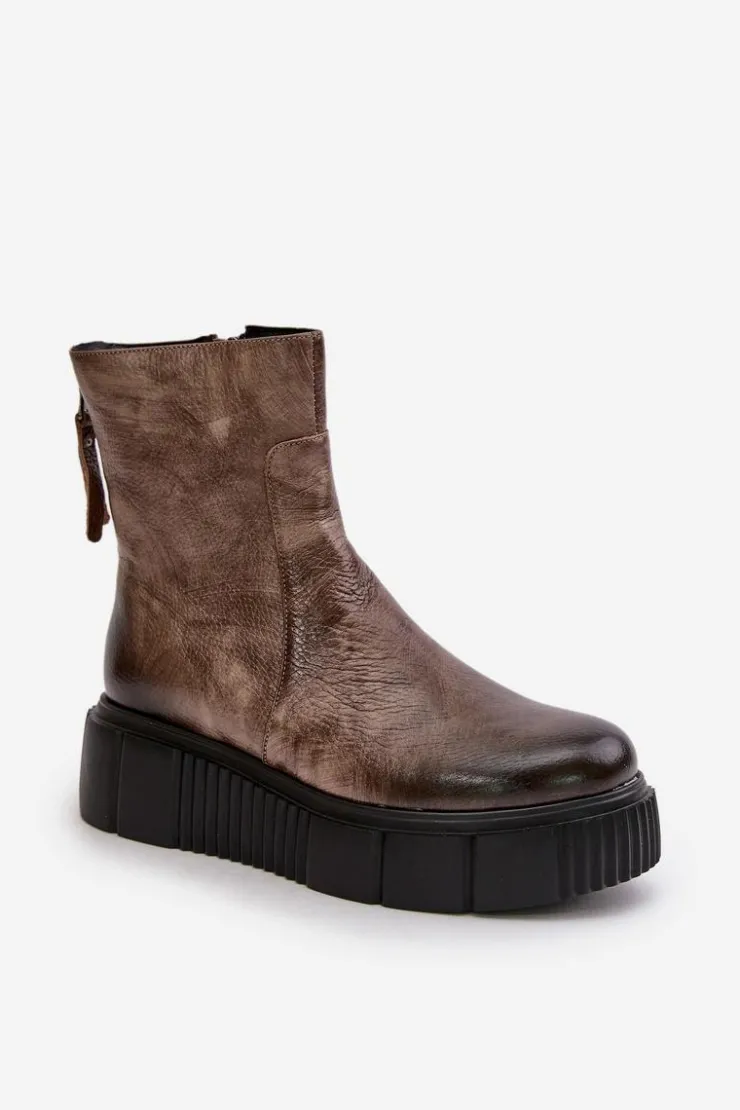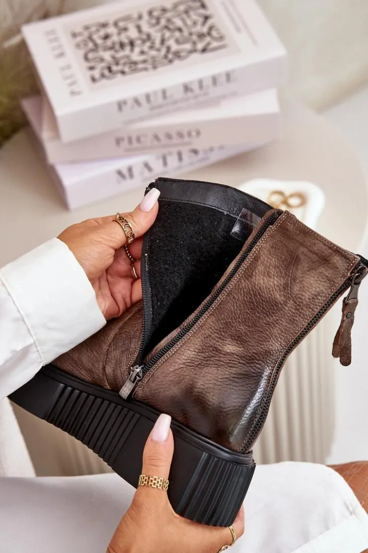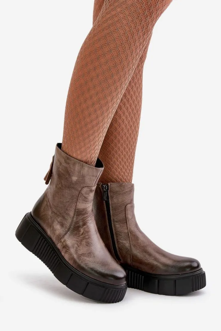 Botki damskie zostały wykonane z wysokiej jakości naturalnych skór. Osadzone na masywnej platformie z delikatnym koturnem. Zapinane z boku cholewki na suwak, natomiast suwak z tyłu jest ozdobny. Dodatkowo botki posiadają usztywniany zapiętek. Ocieplone w środku filcem. Model ten na pewno sprawdzi się w wielu jesiennych stylizacjach! Przy wyborze rozmiaru prosimy kierować się tabelą rozmiarów