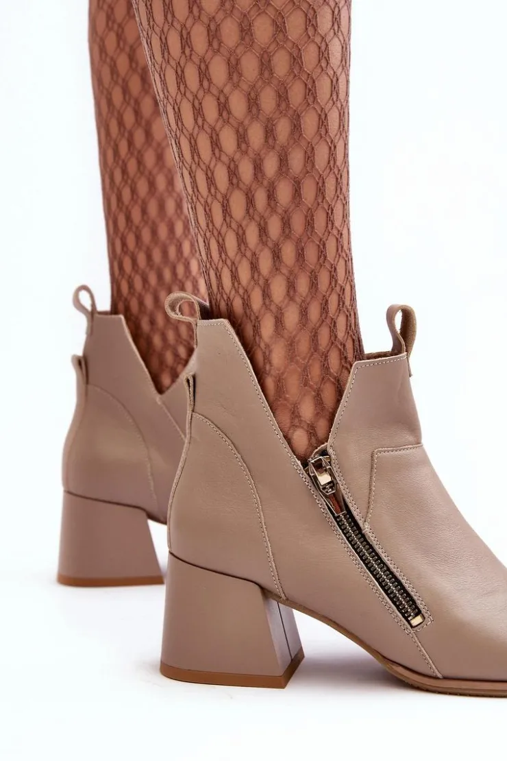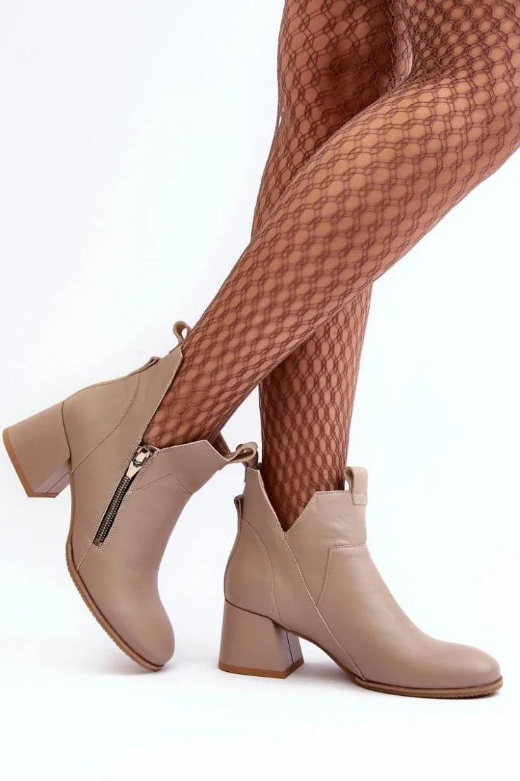Botki damskie z cholewką za kostkę. Wykonane ze skóry naturalnej. Osadzone na niskim, stabilnym obcasie w postaci klocka. Zapinane na suwak po zewnętrznej stornie. Środek ocieplony. Noski zaokrąglone. Usztywniony zapiętek. Botki te doskonale sprawdzą się w jesiennych stylizacjach. Przy wyborze rozmiaru prosimy kierować się tabelą rozmiarów