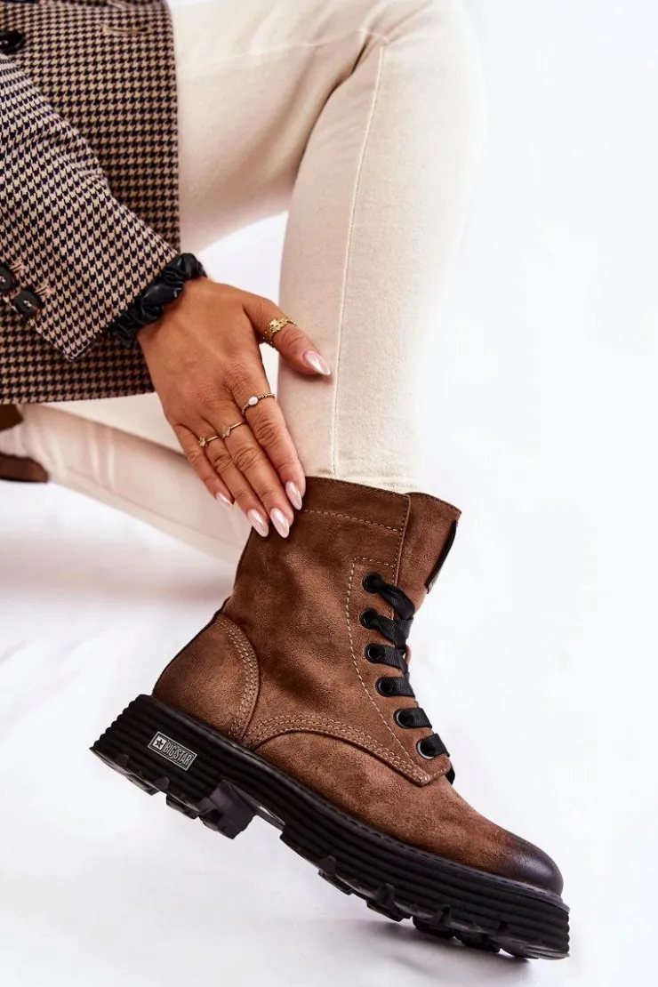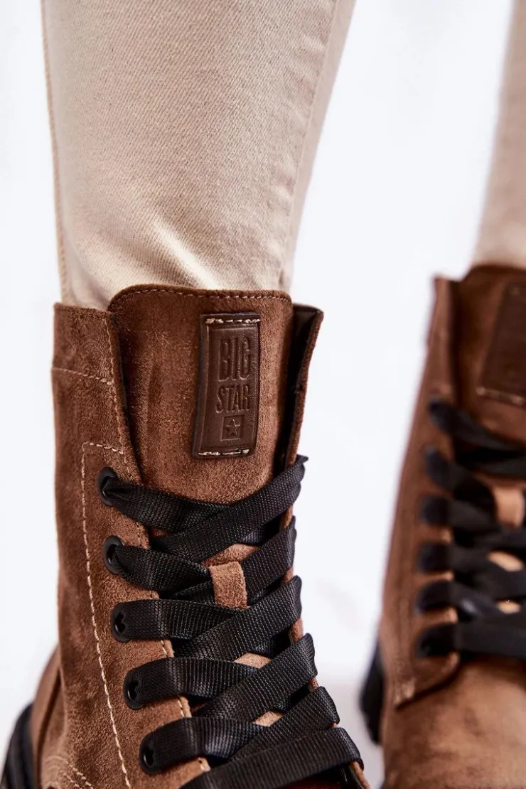 Wyjątkowe botki marki Big Star zostały wykonane z eko zamszu. Posiadają modne przetarcia przy nosku i z tyłu cholewki. Dodatkowo zapiętek jest usztywniany. Zapinane z boku cholewki na suwak oraz klasycznie sznurowane. Botki posiadają ocieplenie w postaci miłego w dotyku koca obuwniczego. Osadzone na delikatnej platformie i płaskim obcasie. Przy wyborze rozmiaru prosimy sugerować się tabelą rozmiarów.