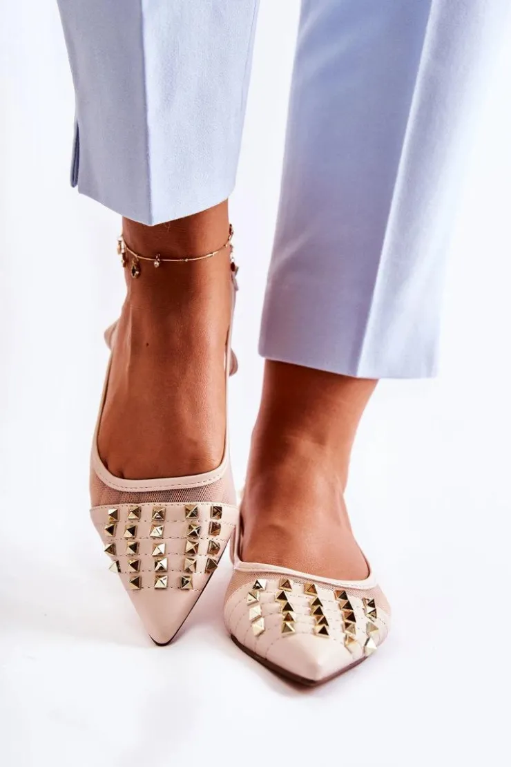 Modne baleriny z odkrytą piętą zostały wykonane z połączenia eko skóry oraz przewiewnego materiału. Wszyta gumka ułatwia zakładanie oraz sprawia, że buty są lepiej dopasowane do stopy. Miękka, eko skórzana wkładka zapewni komfort podczas użytkowania. Osadzone na niskim obcasie. Przód przyozdobiony ćwiekami z noskiem w szpic. Koniecznie sprawdź całą naszą kolekcję balerinek! Podczas wyboru rozmiaru prosimy sugerować się tabelą rozmiarów.