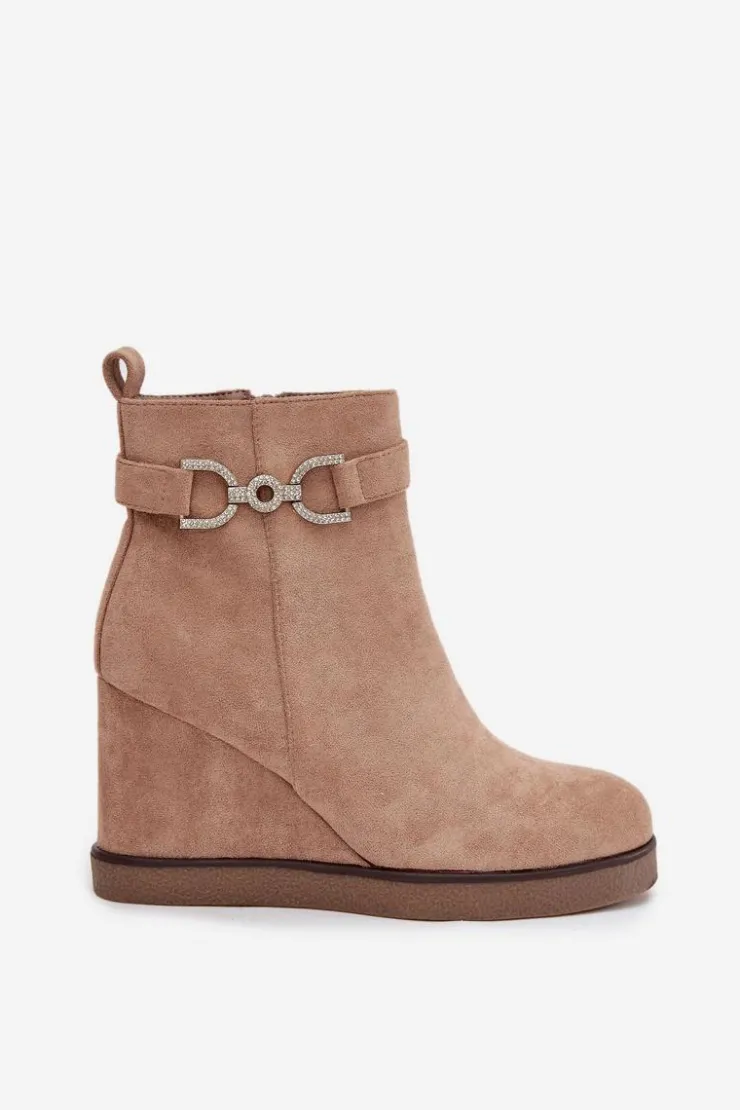 Botki damskie z eko zamszu to stylowa propozycja dla kobiet ceniących wygodę i modny wygląd. Osadzone na koturnie zapewniają komfort noszenia i subtelnie podkreślają sylwetkę, a zaokrąglone noski nadają im klasycznego charakteru. Model wyróżnia się paskiem z ozdobnym detalem umieszczonym na górze cholewki, który dodaje całości eleganckiego akcentu. Zamek po boku ułatwia zakładanie i zdejmowanie, czyniąc buty praktycznym wyborem na co dzień. Przy wyborze rozmiaru prosimy sugerować się tabelą rozmiarów.