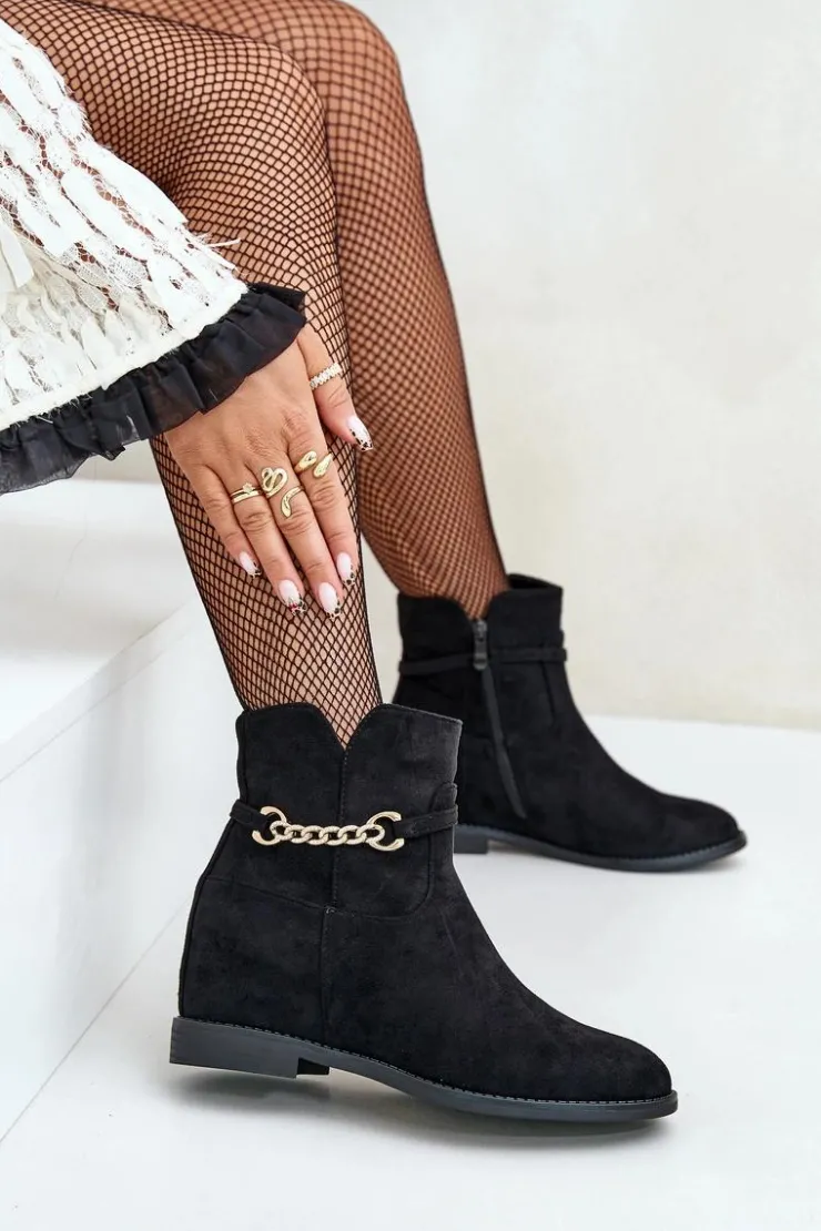 Botki damskie wykonane z eko zamszu. Osadzone na płaskim obcasie i ukrytym koturnie. Noski zaokrąglone. Zapinane na zamek. Dodatkowym atutem tego modelu jest cienki paseczek ze złotym, krótkim łańcuszkiem. Przy wyborze rozmiaru prosimy sugerować się tabelą rozmiarów.