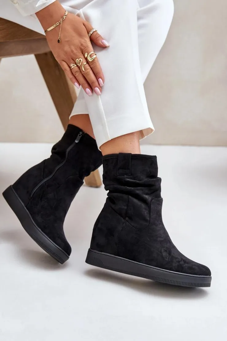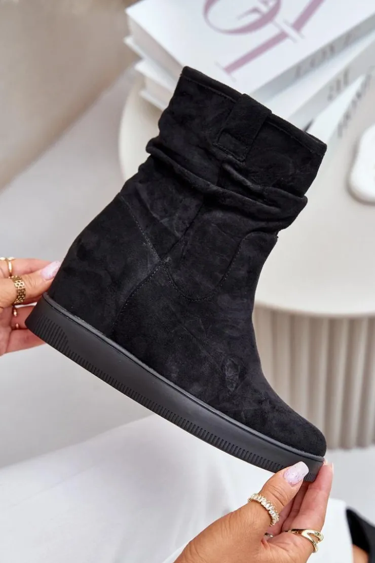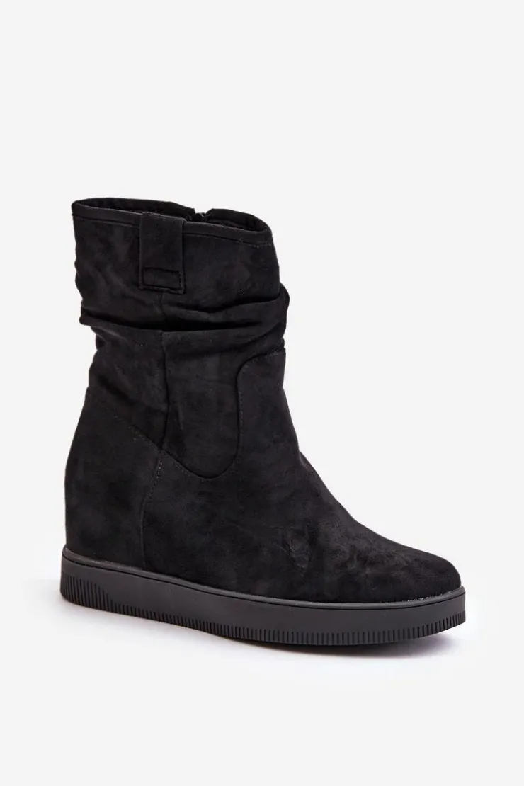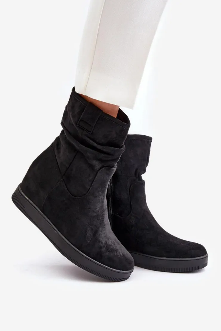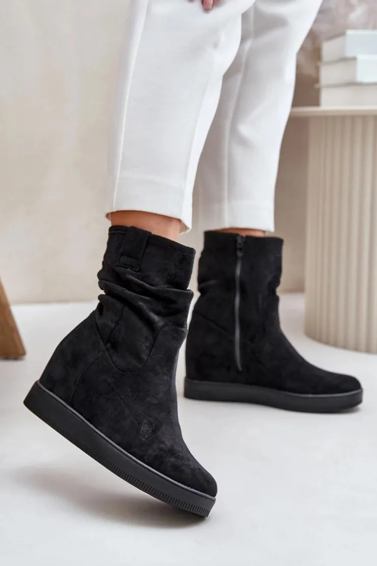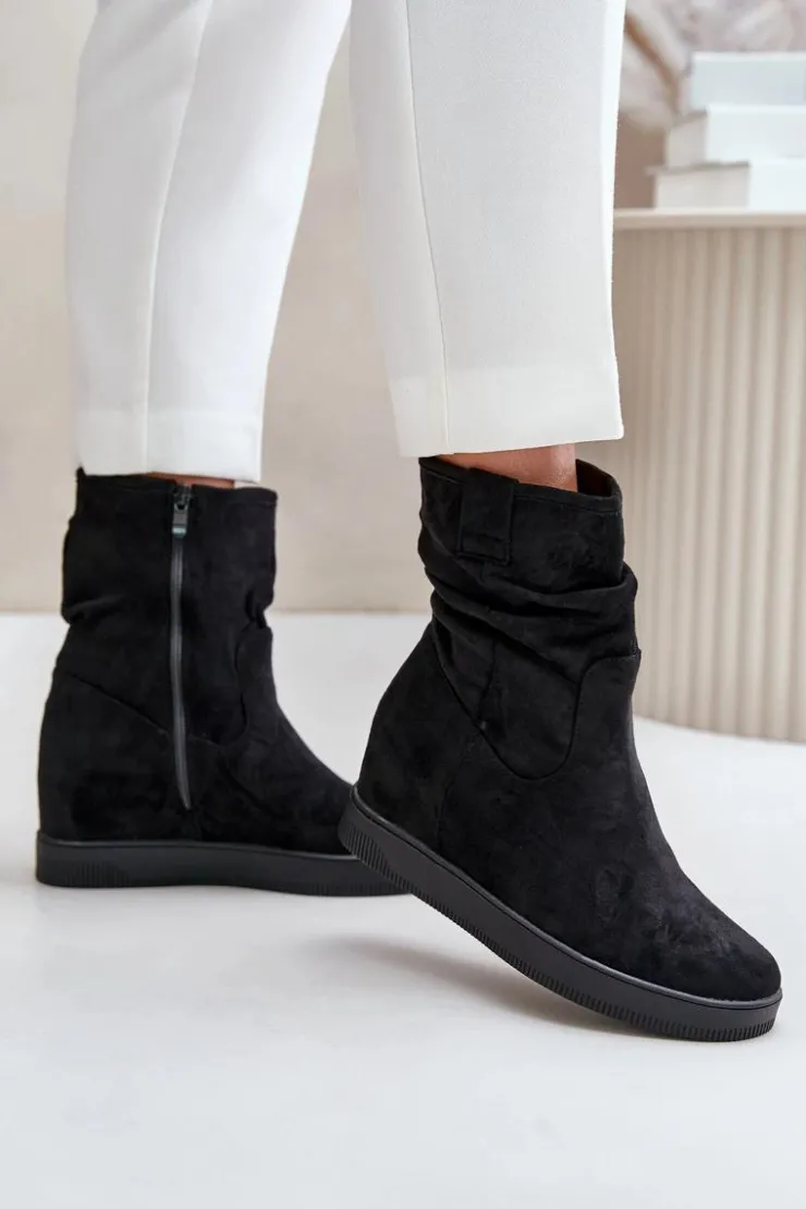 Damskie botki wykonane z eko zamszu. Osadzone na ukrytym koturnie, co subtelnie dodaje centymetrów, nie rezygnując z komfortu. Cholewka ozdobiona marszczeniem, które nadaje całości modnego charakteru. Model zapinany na zamek, co ułatwia zakładanie i zapewnia idealne dopasowanie do nogi. Przy wyborze rozmiaru prosimy sugerować się tabelą rozmiarów.