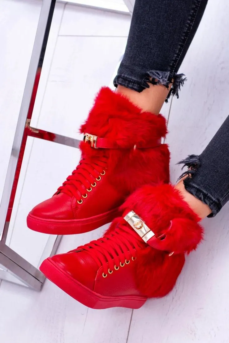 Boto Botki Na Koturnie|Botki Sznurowane*Lu Boo Czerwone Botki z Naturalnym Futrem Gisele