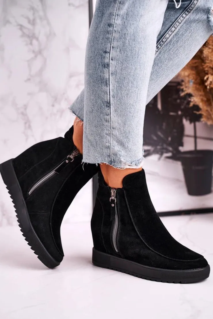 Model botków, który pasuje do każdej stylizacji dzięki swojej klasycznej stylistyce. Wierzch został wykonany z eko zamszu. Botki posiadają srebrne suwaki z obu stron – ozdobny oraz funkcjonalny, ułatwiający zakładanie. Lekka i wygodna konstrukcja z ukrytym koturnem uniesie twoją sylwetkę. Przy wyborze rozmiaru prosimy sugerować się tabelą rozmiarów.
