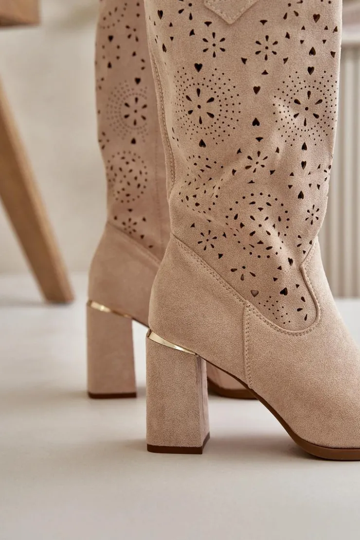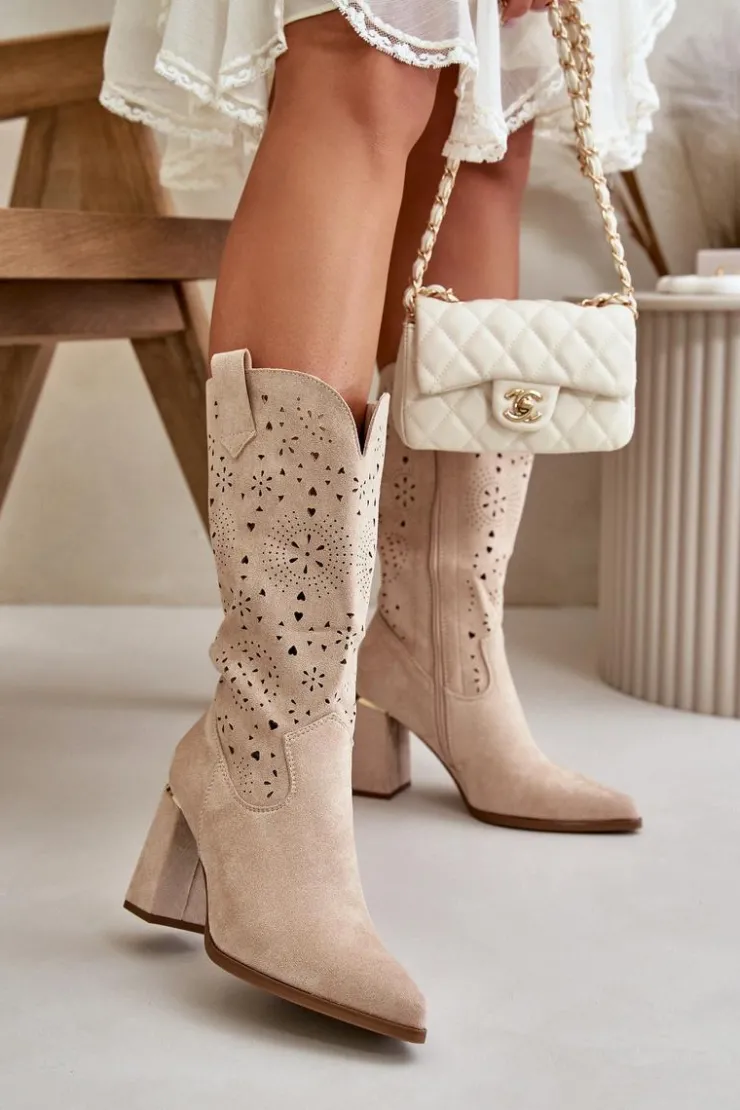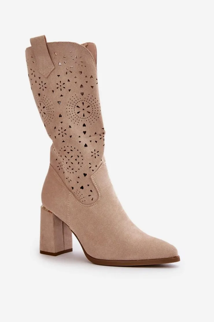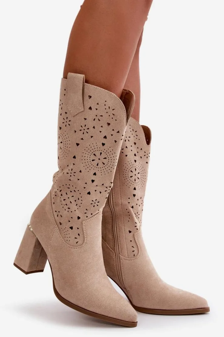 Damskie botki z przyjemnego w dotyku eko zamszu. Posiadają ażurową cholewkę sięgającą do połowy łydki. Osadzone na słupkowym obcasie z lustrzanym akcentem. Zapinane na zamek, z noskami w szpic. Ten modny i elegancki fason będzie idealnym dopełnieniem wielu stylizacji! Przy wyborze rozmiaru prosimy sugerować się tabelą rozmiarów.