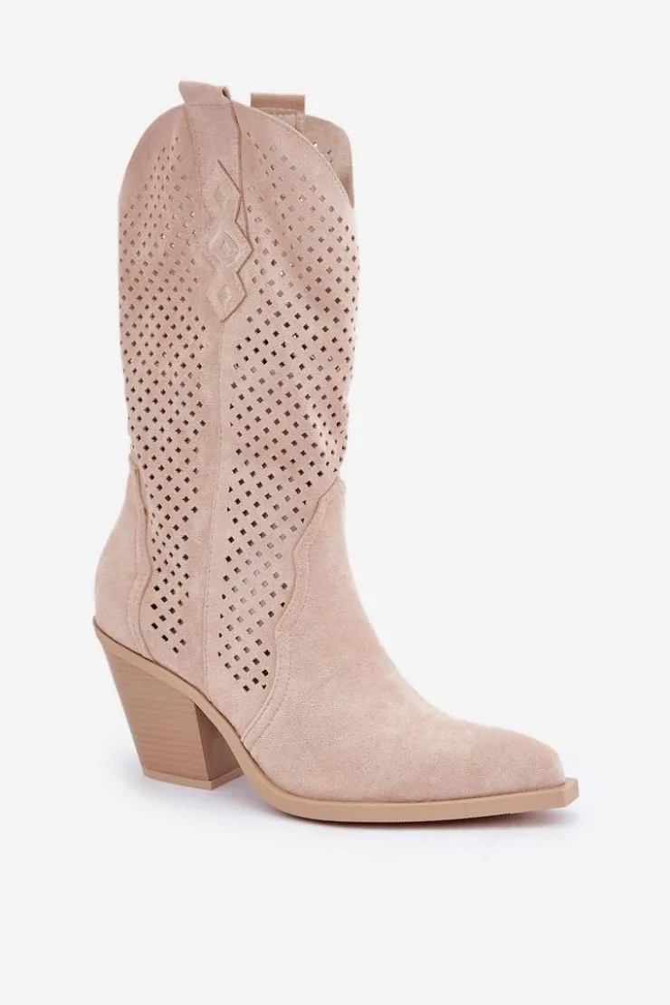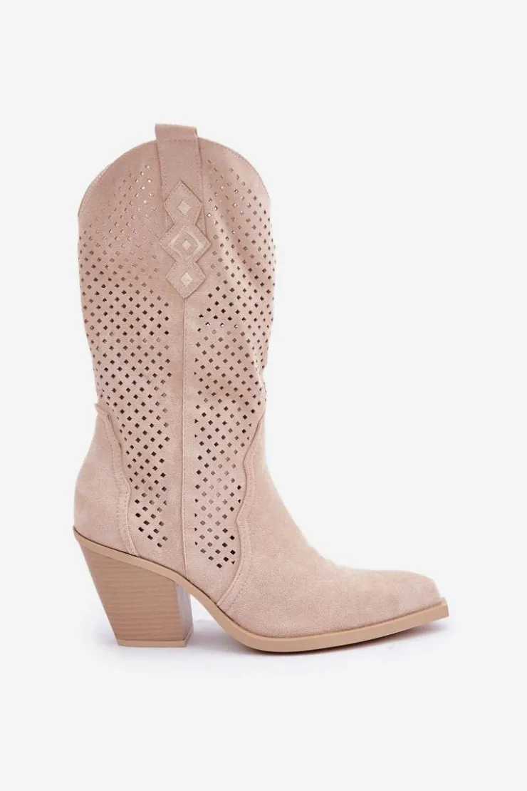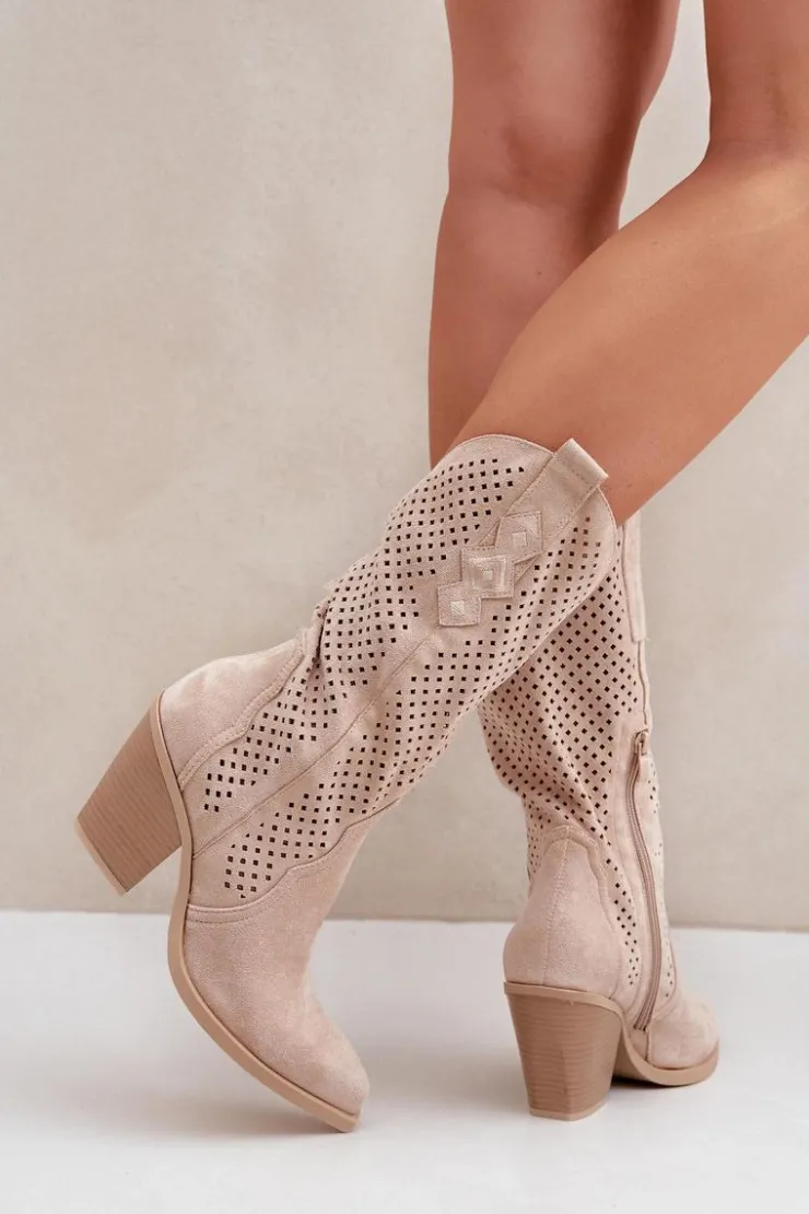 Botki kowbojki to wyjątkowy model dla kobiet, które cenią sobie połączenie stylu i komfortu. Ażurowa cholewka dodaje unikalnego charakteru. Miękka wkładka wykonana z eko skóry zapewnia doskonały komfort noszenia, dbając o stopy nawet podczas długiego użytkowania. Stabilny obcas słupek łączy elegancję z praktycznością, umożliwiając swobodne poruszanie się. Model wsuwany z dodatkowym zapięciem na zamek gwarantuje łatwe zakładanie oraz idealne dopasowanie do stopy. Szpiczaste noski podkreślają kobiecość i dodają wyrafinowanego wyglądu. Stylowe botki kowbojki doskonale komponują się zarówno z jeansami, jak i bardziej eleganckimi stylizacjami, nadając im wyrazisty i modny akcent. Idealne na każdą okazję, te botki są must-have w każdej garderobie! Przy wyborze rozmiaru prosimy sugerować się tabelą rozmiarów.