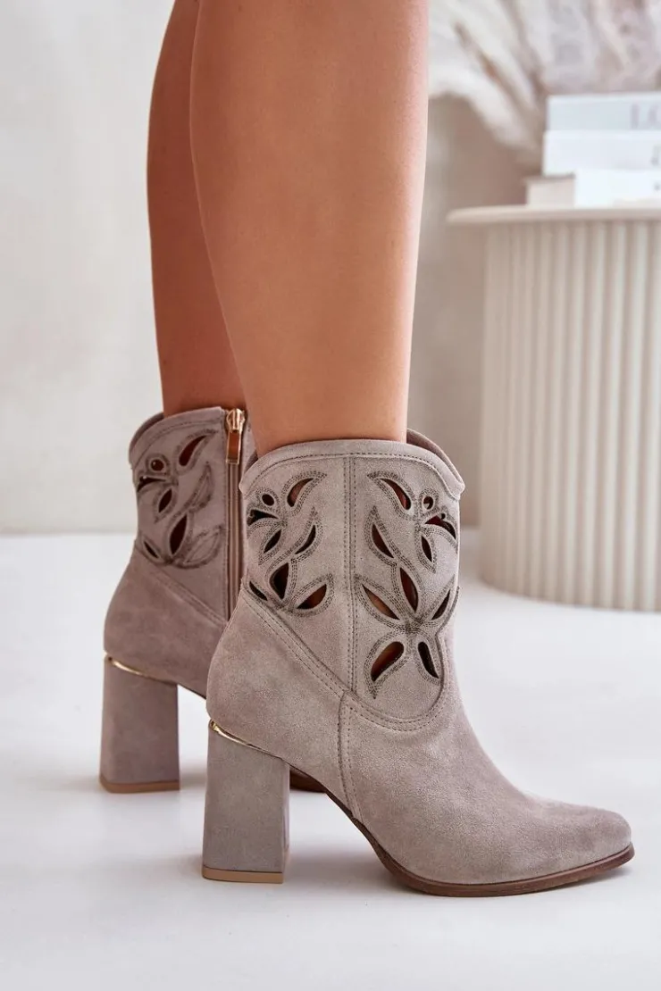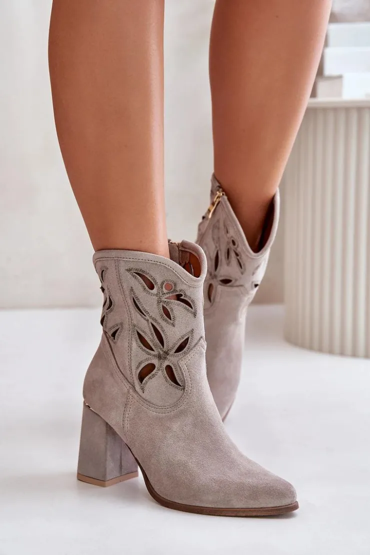 Modne, ażurowe botki na obcasie w postaci słupka. Wykonane z wysokiej jakości naturalnego zamszu. Głównym atutem tego modelu jest ażurowy wzór na cholewce. Zapinane na zamek błyskawiczny. Noski w szpic optycznie wysmuklą nogi. Miękka, niezwykle wygodna wkładka została wykonana z naturalnej skóry. Świetny model do wielu stylizacji! Przy wyborze rozmiaru prosimy sugerować się tabelą rozmiarów.