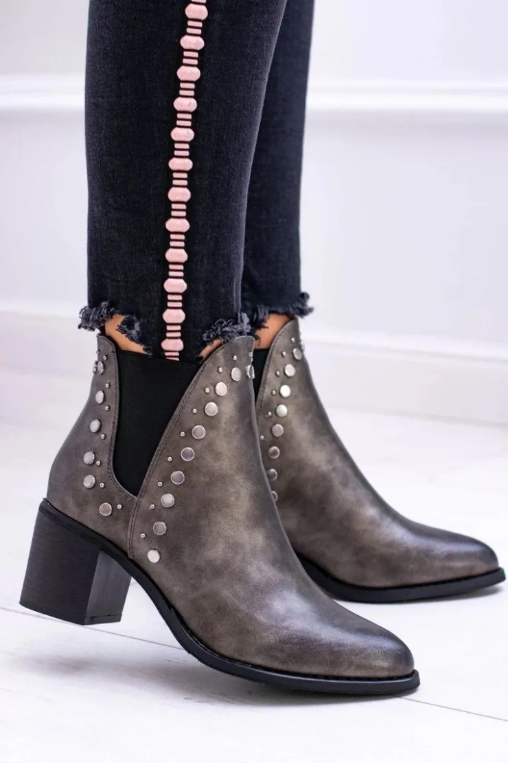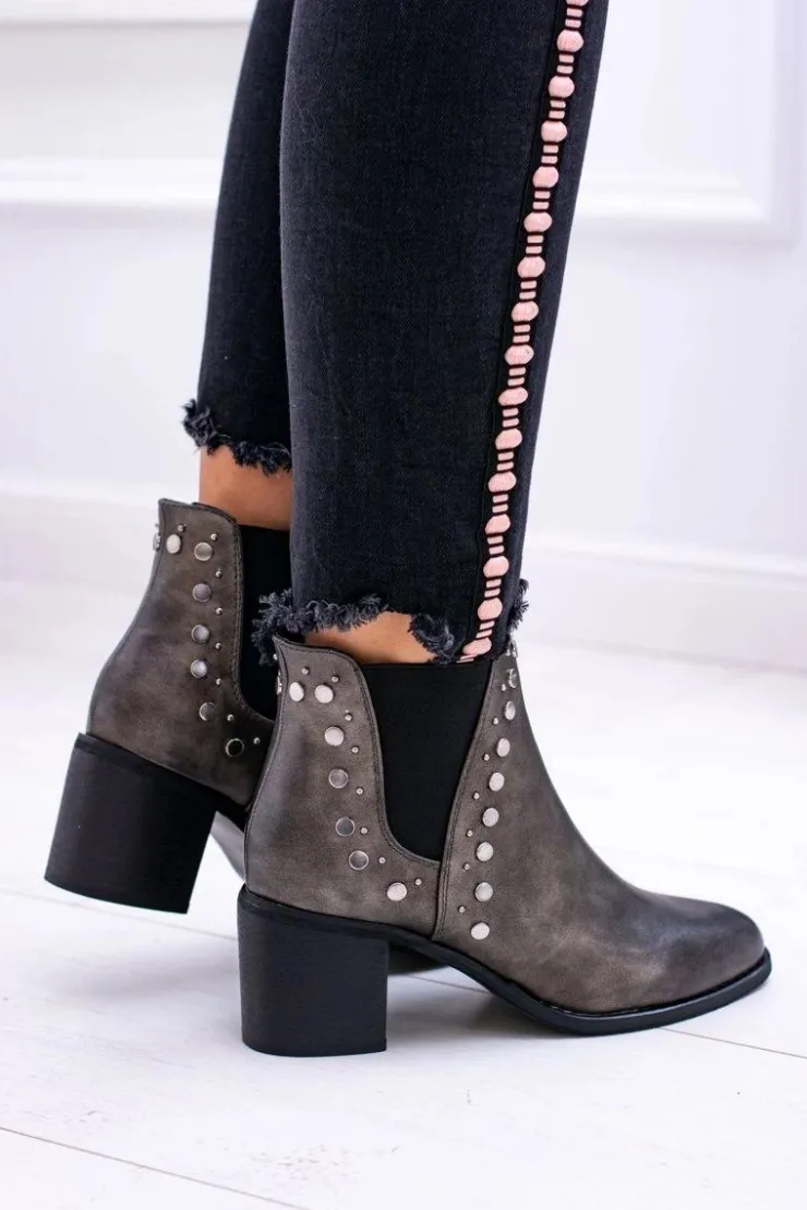 Podczas chłodniejszych dni warto zwrócić szczególną uwagę na buty. Dzięki nim podkreślimy nasze stylizacje a dodatkowo dadzą nam maksimum komfortu w każdej sytuacji. Klasyczne botki z gumkami na boku. Cholewka zdobiona małymi nitami. Wnętrze delikatnie ocieplone futerkiem. Koniecznie sprawdź całą naszą kolekcję sztybletów w super cenach!