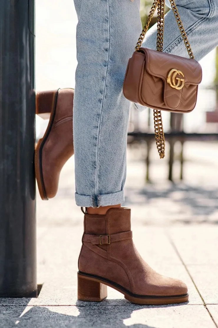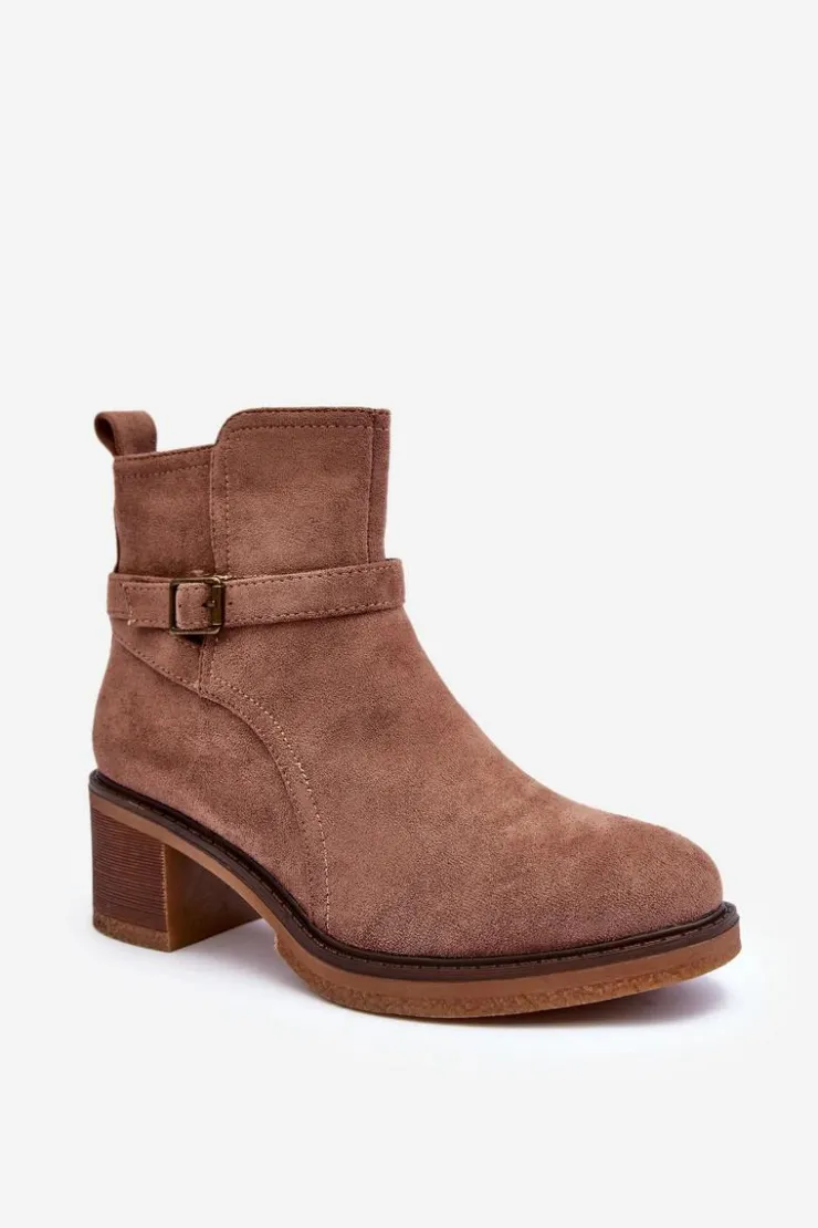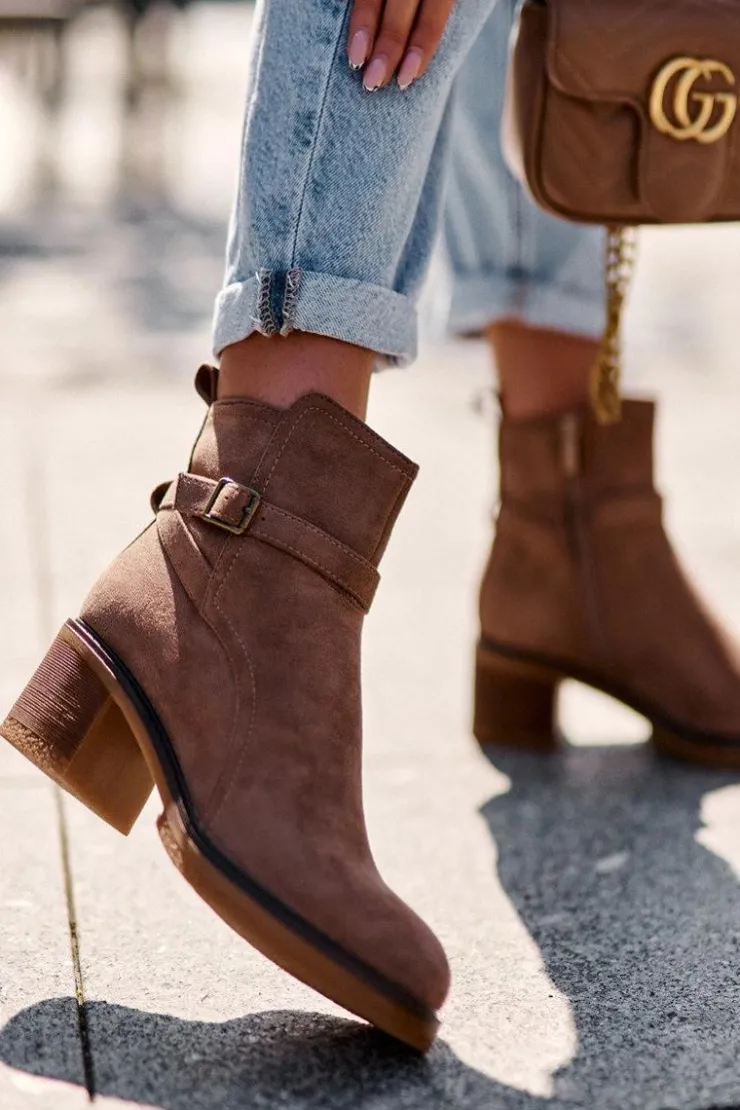 Klasyczne botki wykonane z eko zamszu. Osadzone na obcasie w postaci klocka. Wnętrze ocieplone kocem obuwniczym. Z boku cholewki znajduje się pasek z klamrą. Modny fason sprawia, że możesz założyć je do wielu stylizacji. Nosek zaokrąglony. Buty posiadają także usztywniany zapiętek. W tych botkach jesienne dni nie będą już takie straszne! Przy wyborze rozmiaru prosimy sugerować się tabelą rozmiarów.
