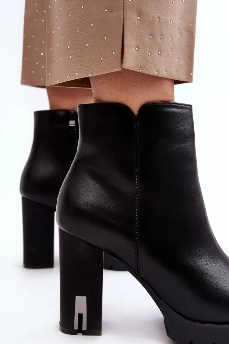Damskie botki wykonane z eko skóry. Osadzone na platformie i obcasie w postaci słupka. Model ten zapinany jest na suwak z boku cholewki. Noski zaokrąglone. Usztywniony zapiętek. Miękka wkładka zapewni komfortowe użytkowanie obuwia. Idealne do jesiennych stylizacji! Przy wyborze rozmiaru prosimy sugerować się tabelą rozmiarów.