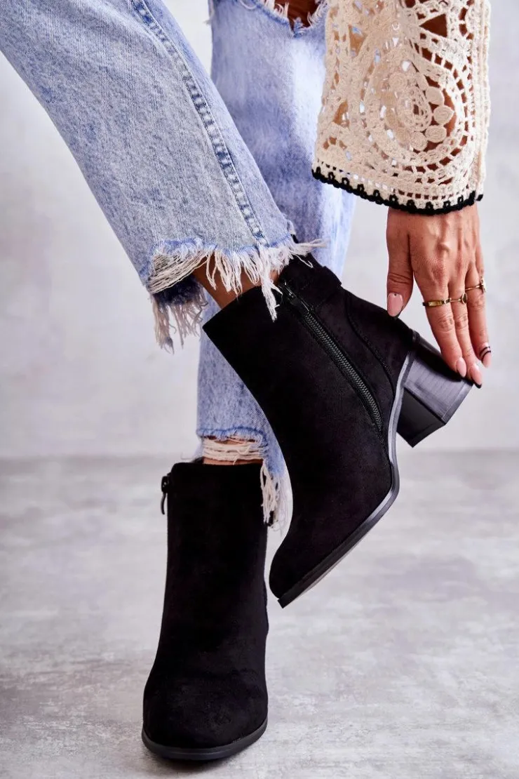 Botki wykonane z eko zamszu. Wnętrze zostało ocieplone miłym w dotyku kocem obuwniczym. Z boku cholewki znajduje się także pasek zapinany na sprzączkę. Obcas w postaci masywnego słupka. Modny fason sprawia, że możesz założyć je do wielu stylizacji. Nosek zaokrąglony. Buty posiadają także usztywniany zapiętek. W tych botkach jesienne dni nie będą już takie straszne! Przy wyborze rozmiaru prosimy sugerować się tabelą rozmiarów.