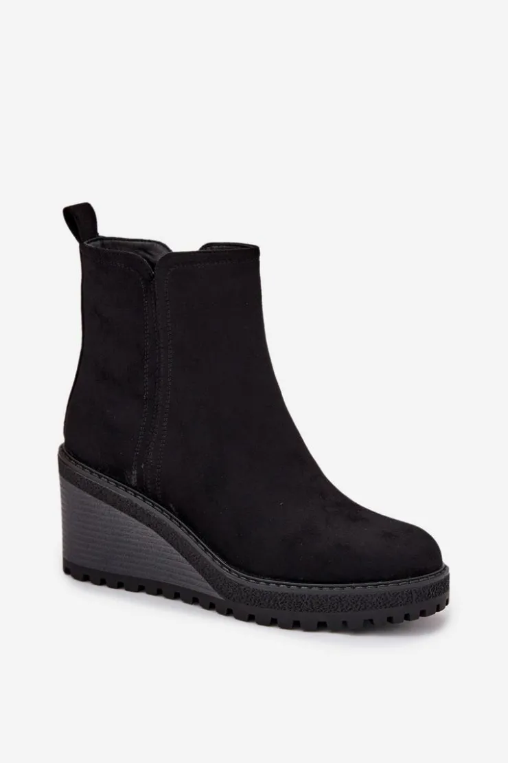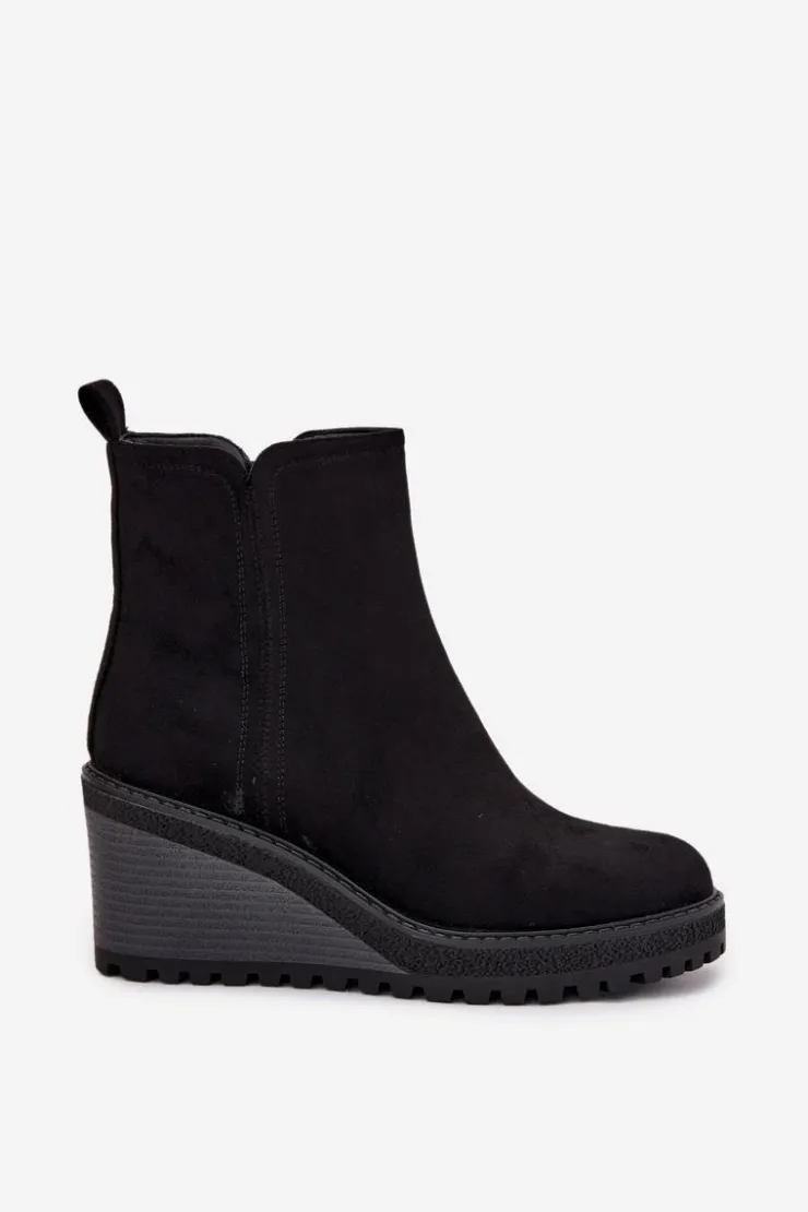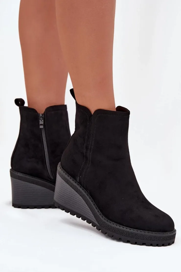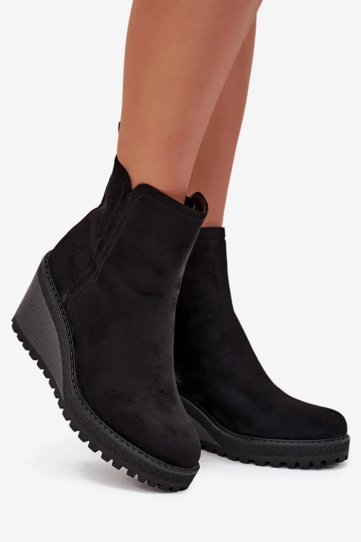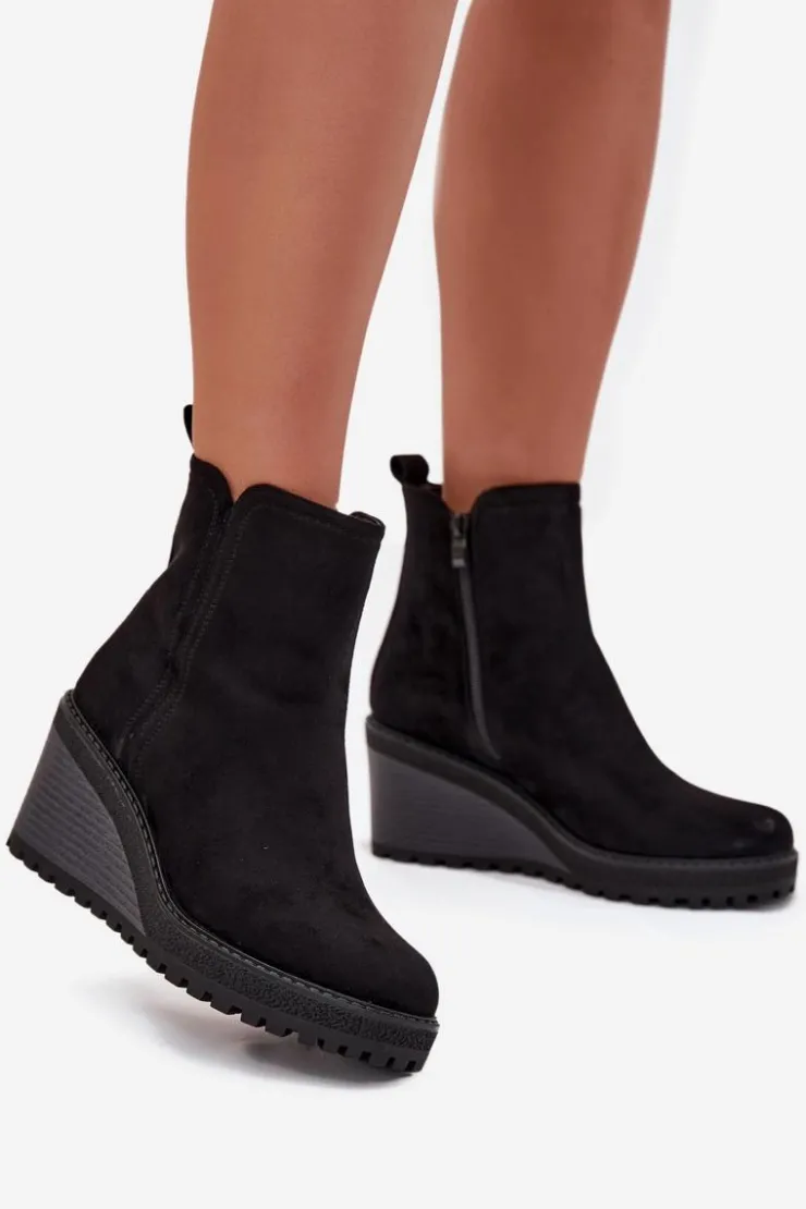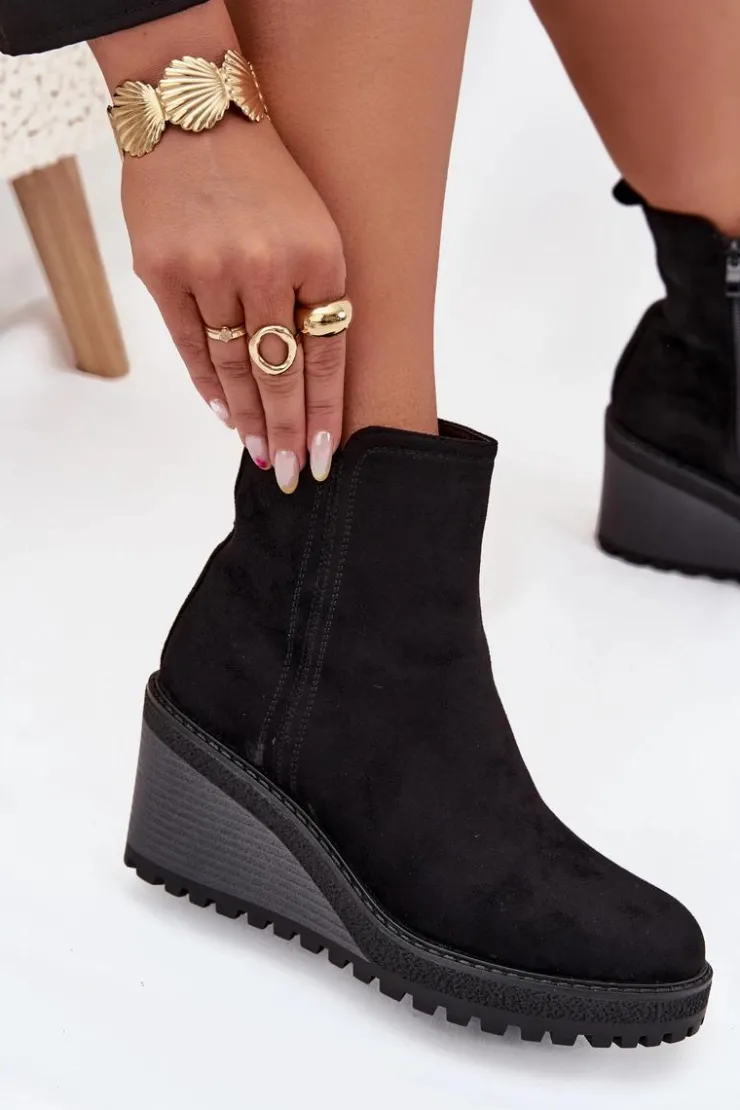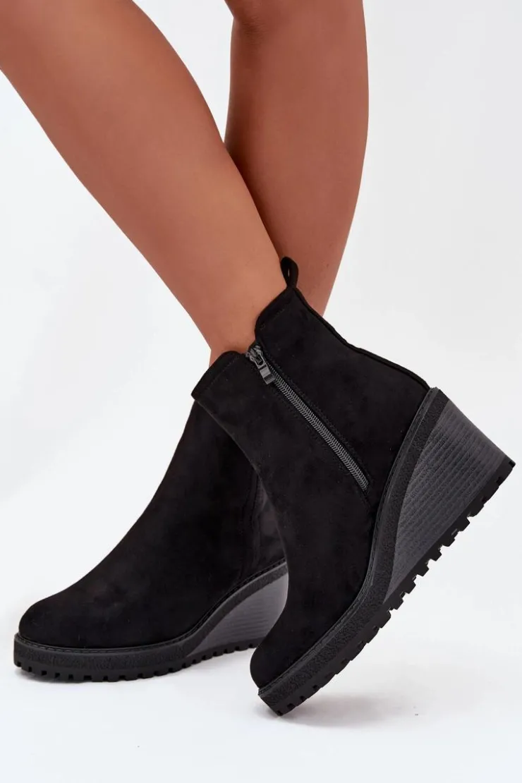 Botki damskie z eko zamszu na koturnie to elegancka i wygodna opcja na chłodniejsze dni. Ocieplane kocem obuwniczym, zapewniają ciepło, a zapinane na zamek ułatwiają zakładanie. Koturna dodaje kilku centymetrów wzrostu. Idealne na co dzień, te botki będą doskonałym uzupełnieniem zimowych stylizacji. Przy wyborze rozmiaru prosimy sugerować się tabelą rozmiarów.