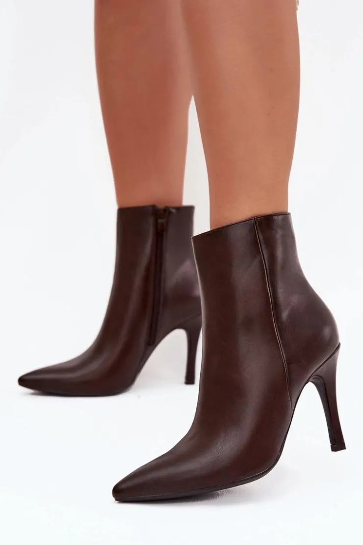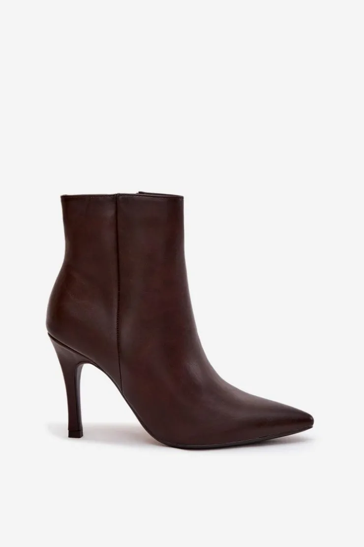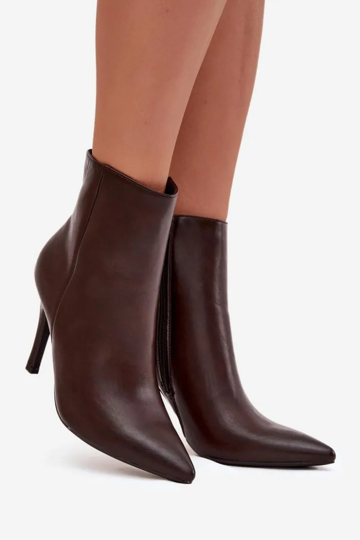 Botki damskie wykonane z eko skóry to elegancka propozycja na chłodniejsze dni. Model zapinany na zamek jest wygodny w użytkowaniu, a ocieplenie kocem obuwniczym zapewnia komfort i ciepło. Szpiczaste noski dodają kobiecego charakteru i subtelnej elegancji. To uniwersalny fason, który doskonale uzupełni zarówno codzienne, jak i bardziej eleganckie stylizacje. Przy wyborze rozmiaru prosimy sugerować się tabelą rozmiarów.